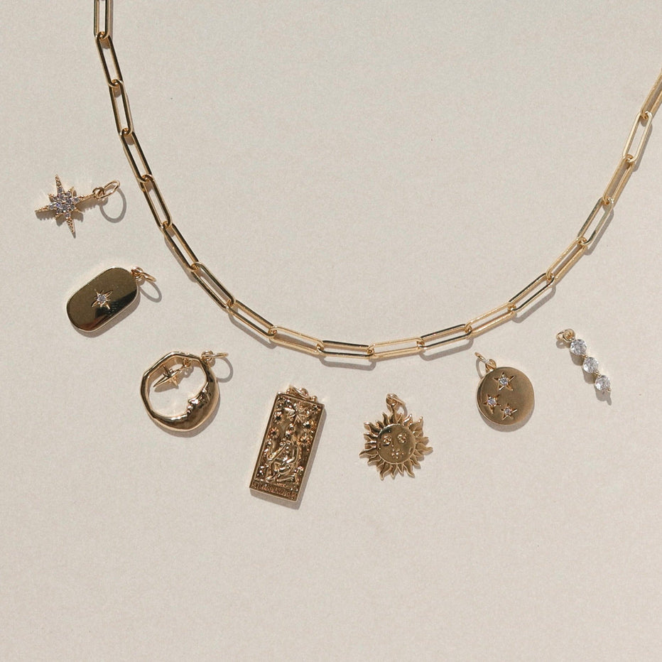 This classic chain necklace serves as a blank canvas, inviting you to express your individuality and creativity through the addition of charms that hold personal significance.