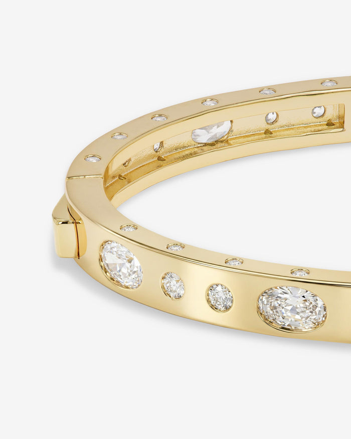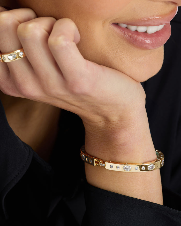 Designed with lock-inspired detailing and accented with a mix of oval and round bezel-set simulated diamonds, finished with a seamless hinge that closes with ease. Ashley just clicks.