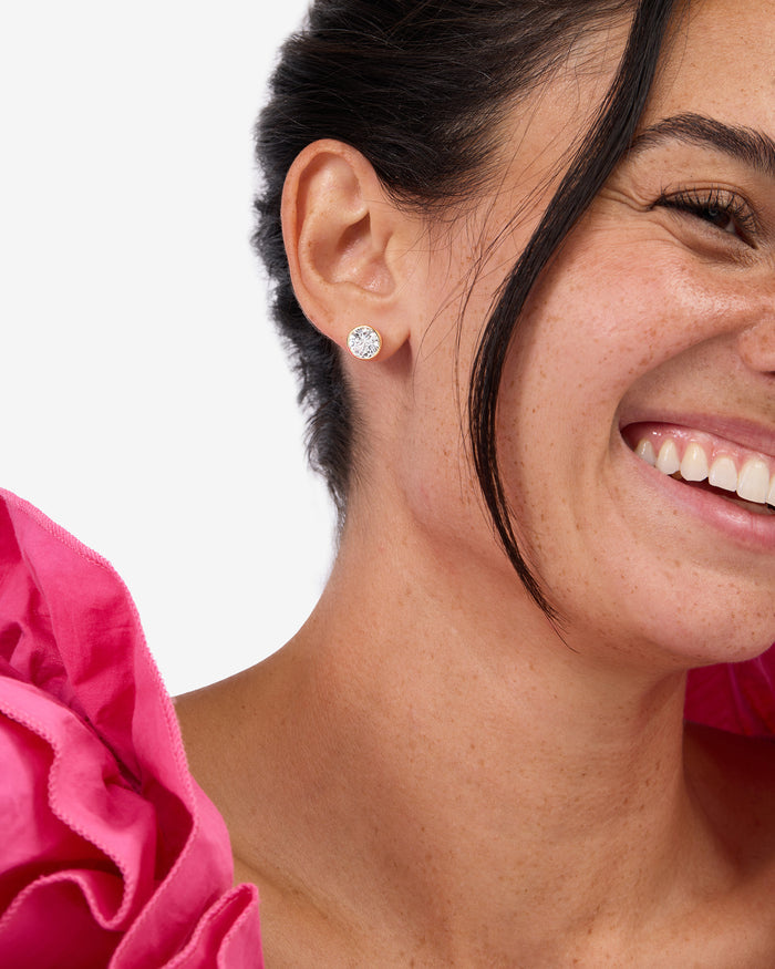 Make a bold statement with the Baroness 8mm Studs. These 18k gold plated earrings feature a large, bezel-set simulated diamond. These studs are the luxury staples you will reach for every single day. Wear them solo or along with your ear stack.