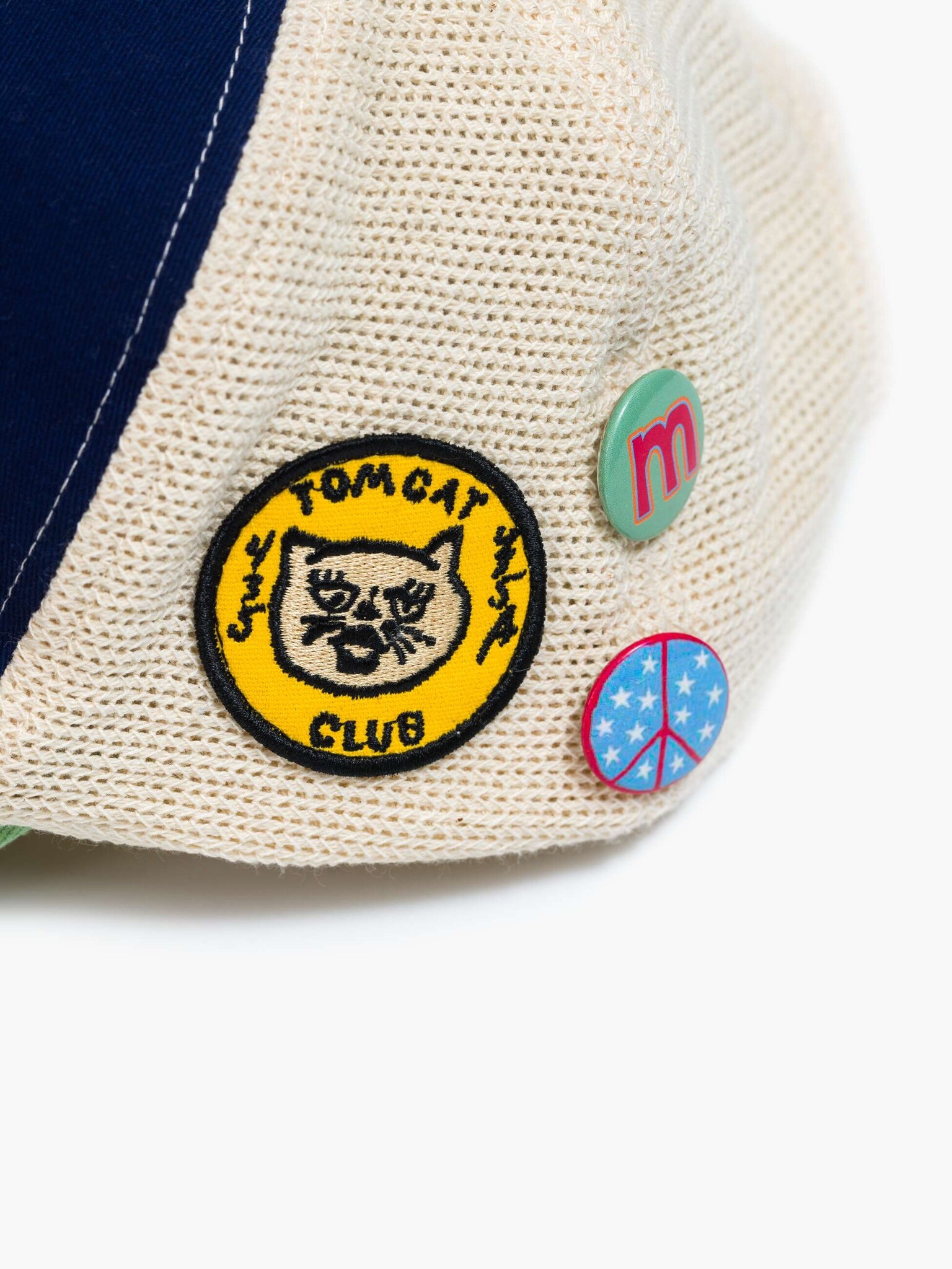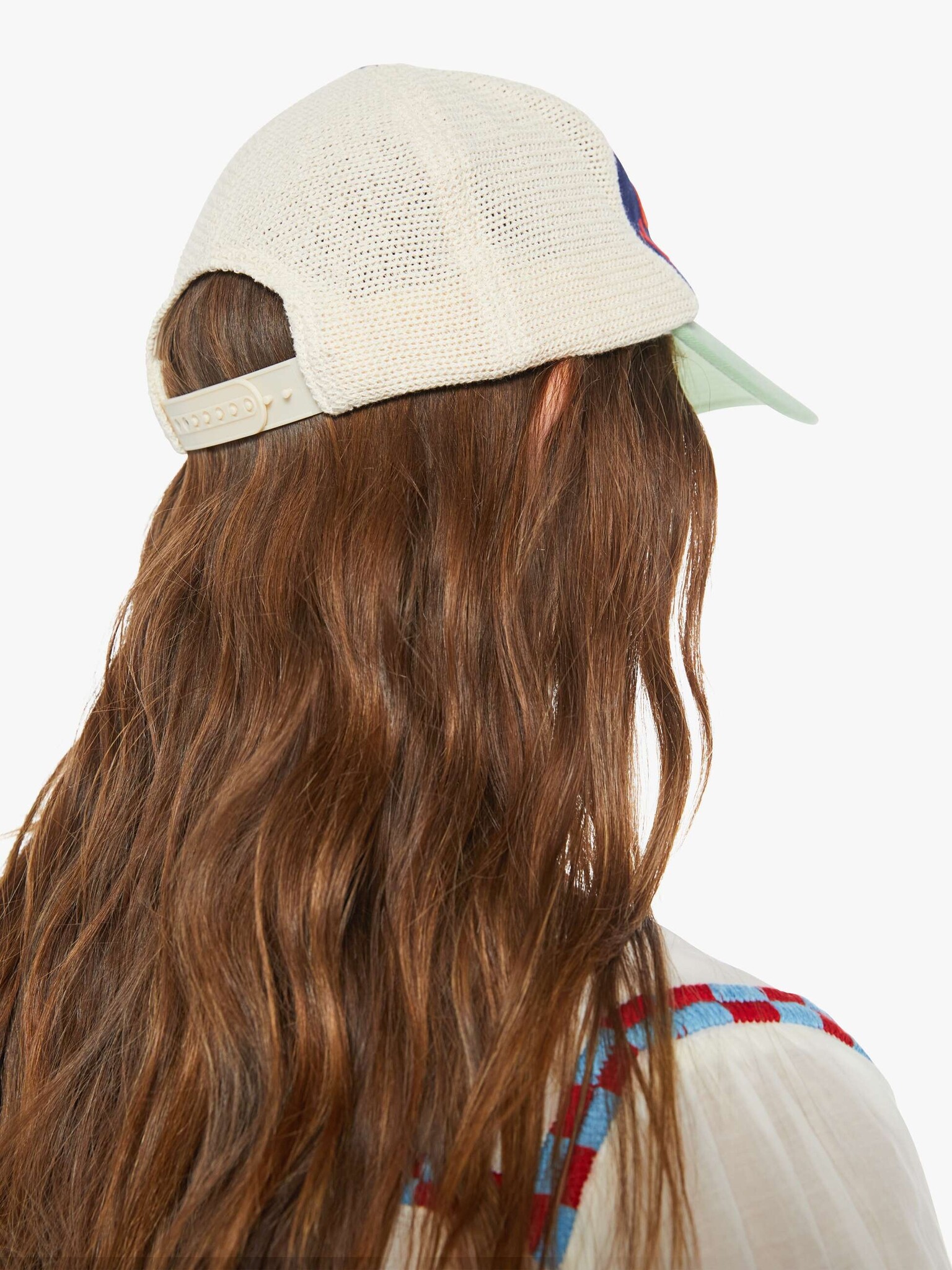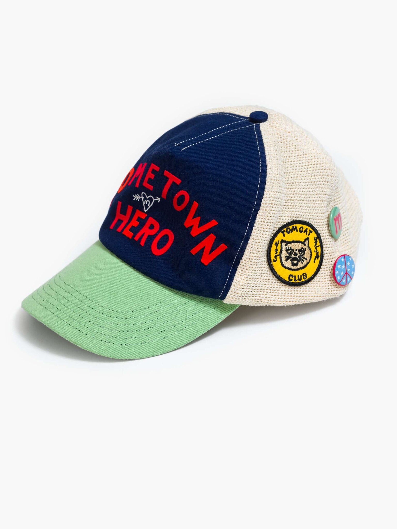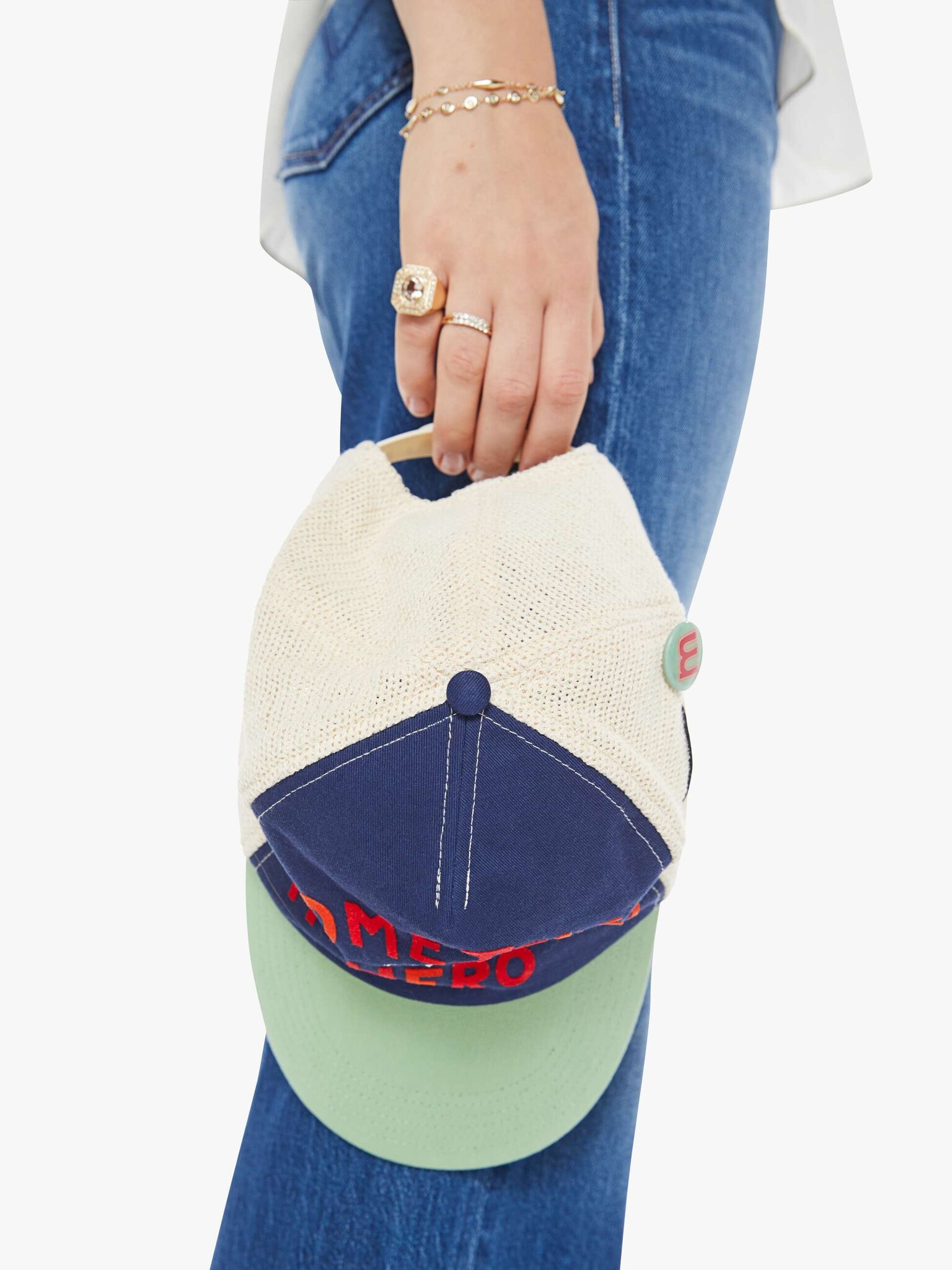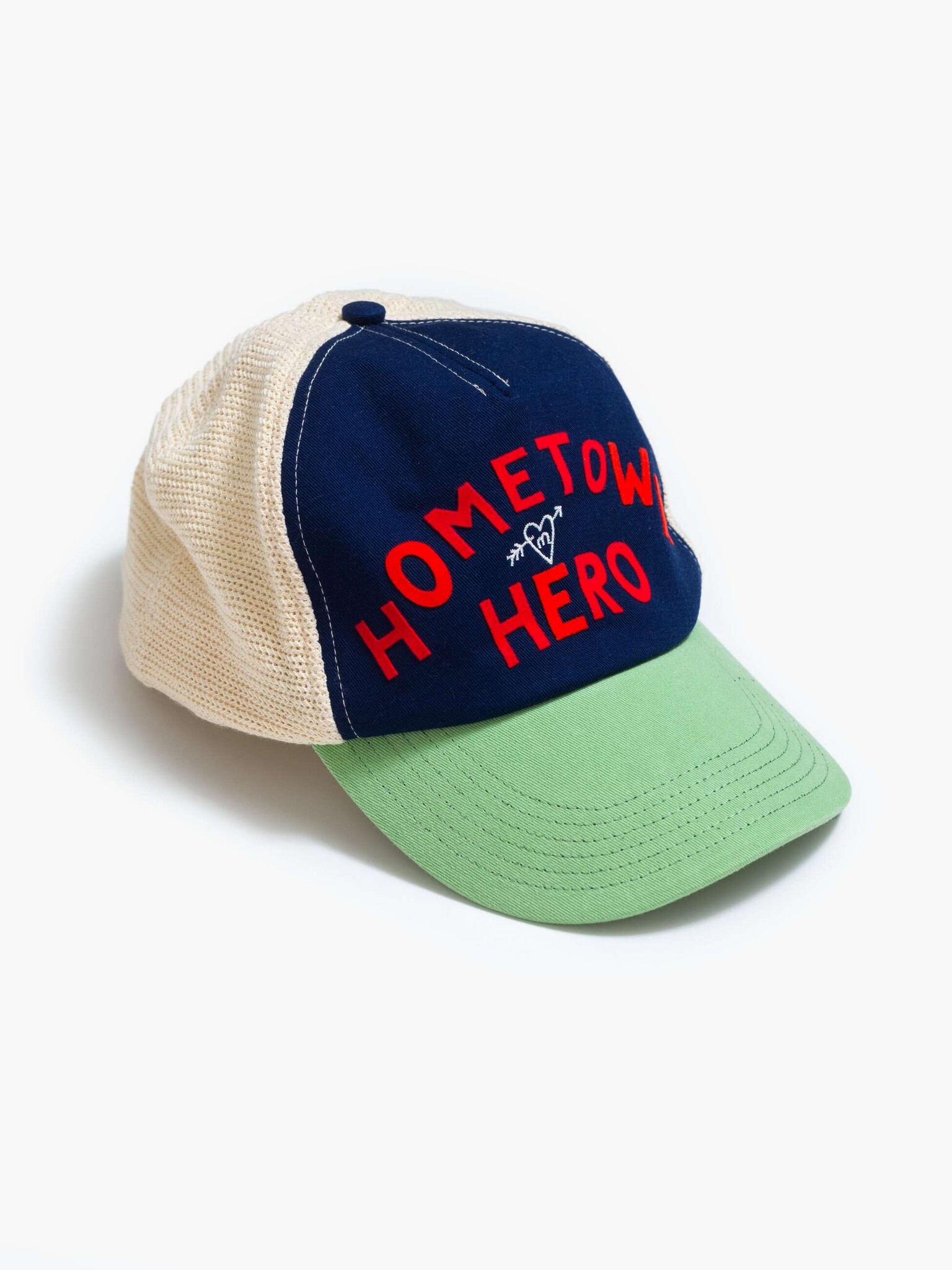 Local legend. A vintage-inspired trucker hat designed in navy with a green brim and text in red on the front.