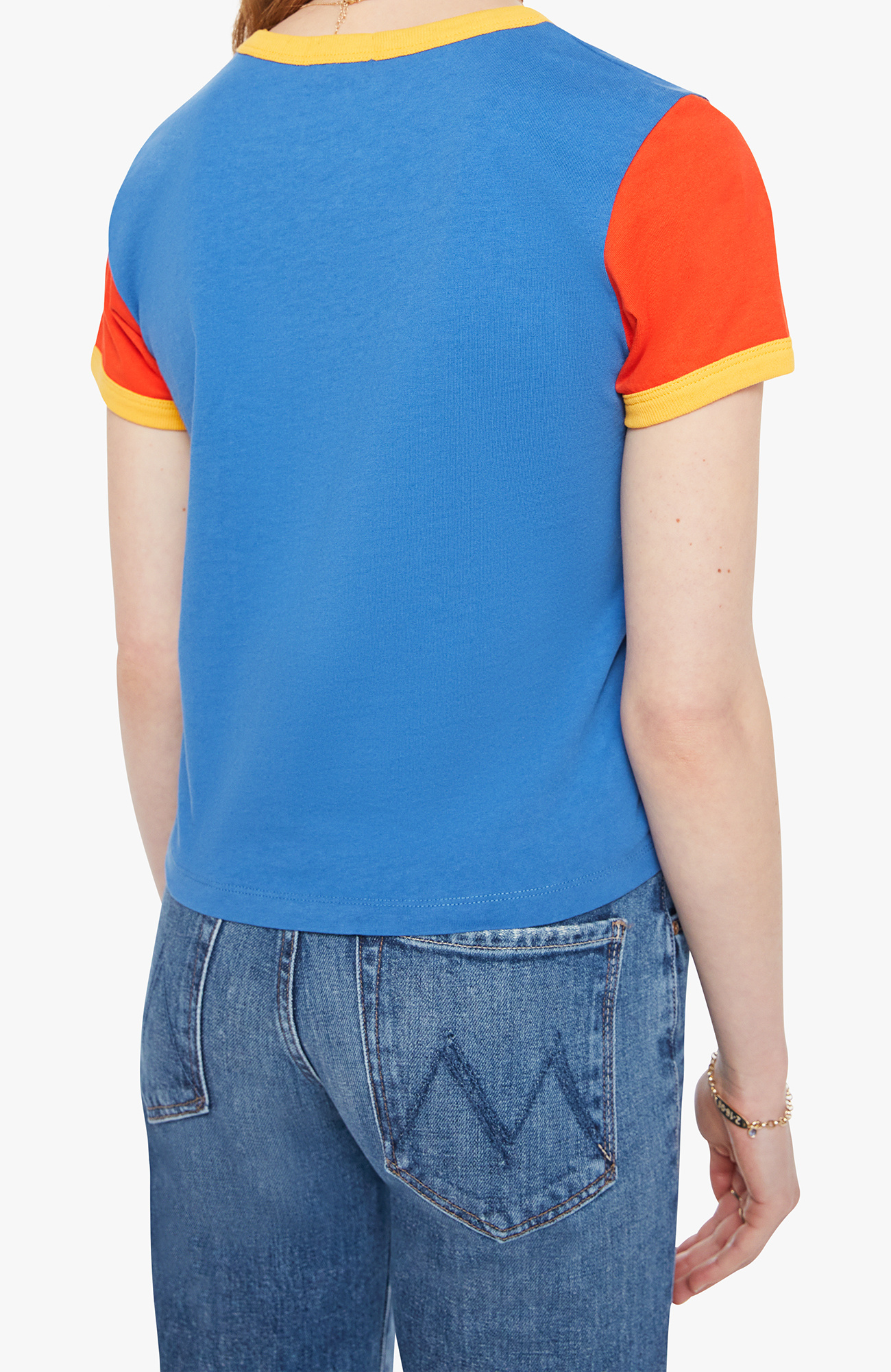 Never enough. A shrunken crewneck tee with extra-short sleeves and a cropped hem. Made from 100% cotton in blue with red sleeves and yellow trim, The Itty Bitty Ringer in More Is More features white block text appliqued on the front.