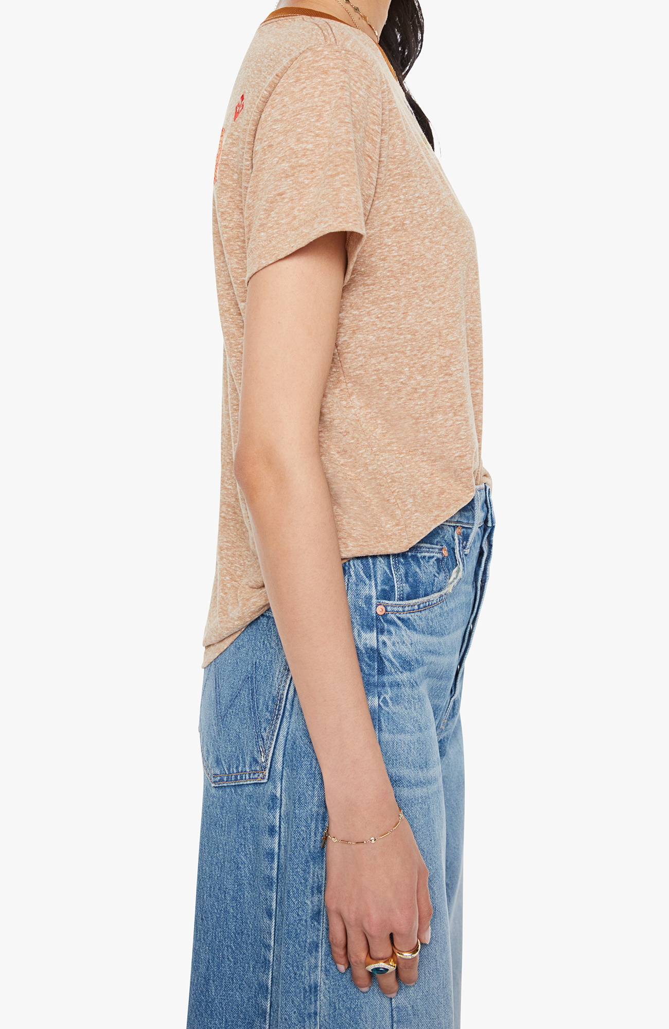 Shine on. A soft crewneck with a slim fit for a vintage look and feel. Made from a cotton blend in heathered tan with dark brown trim along the neck, the tee features red text and colorful folk-inspired embroidery throughout.