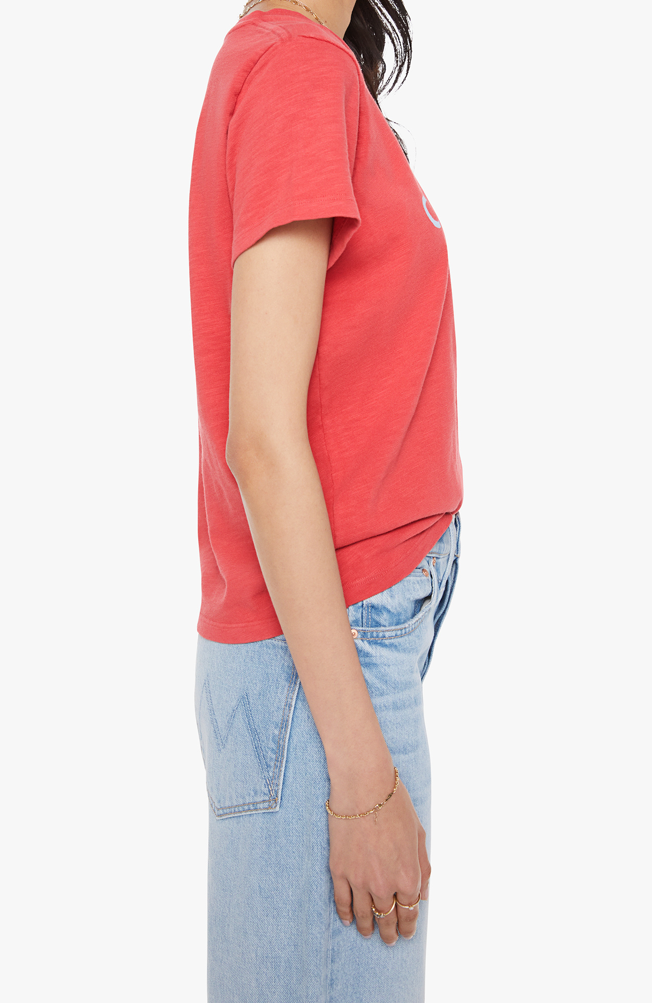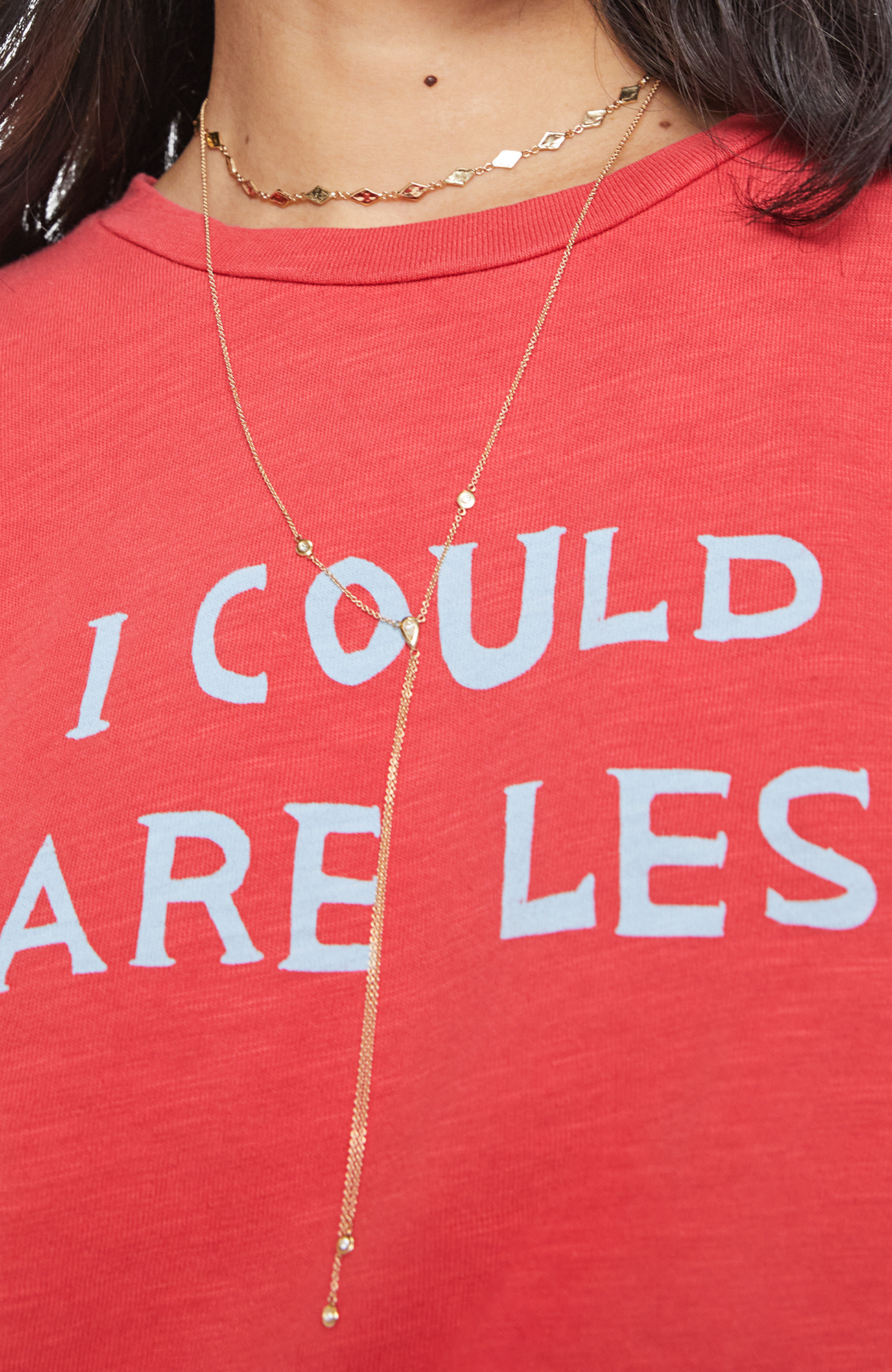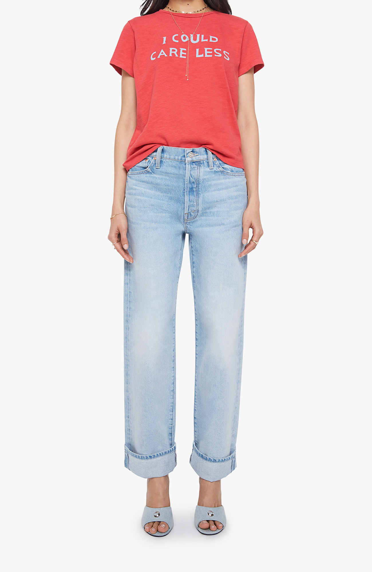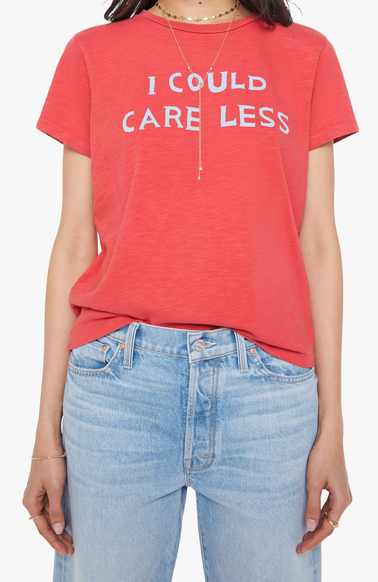 I could care less. A soft crewneck with a slim fit for a vintage look and feel. Made from SUPERIOR 100% cotton in faded red, the tee features a white text graphic on the front.