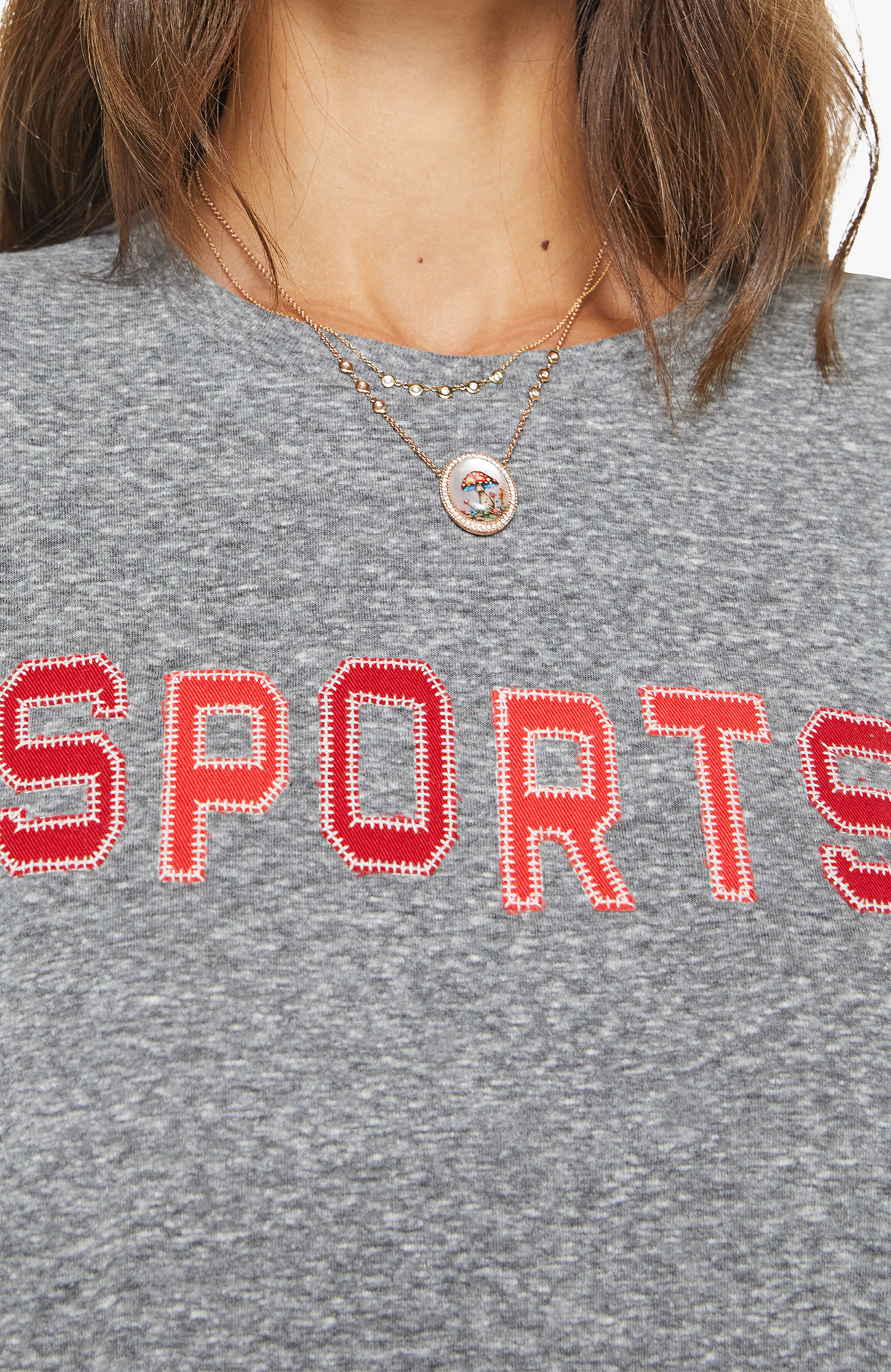 Game on. A crewneck tee with an oversized fit and a clean hem. Made from a cotton blend, the heathered grey tee features red letter patches on the front.