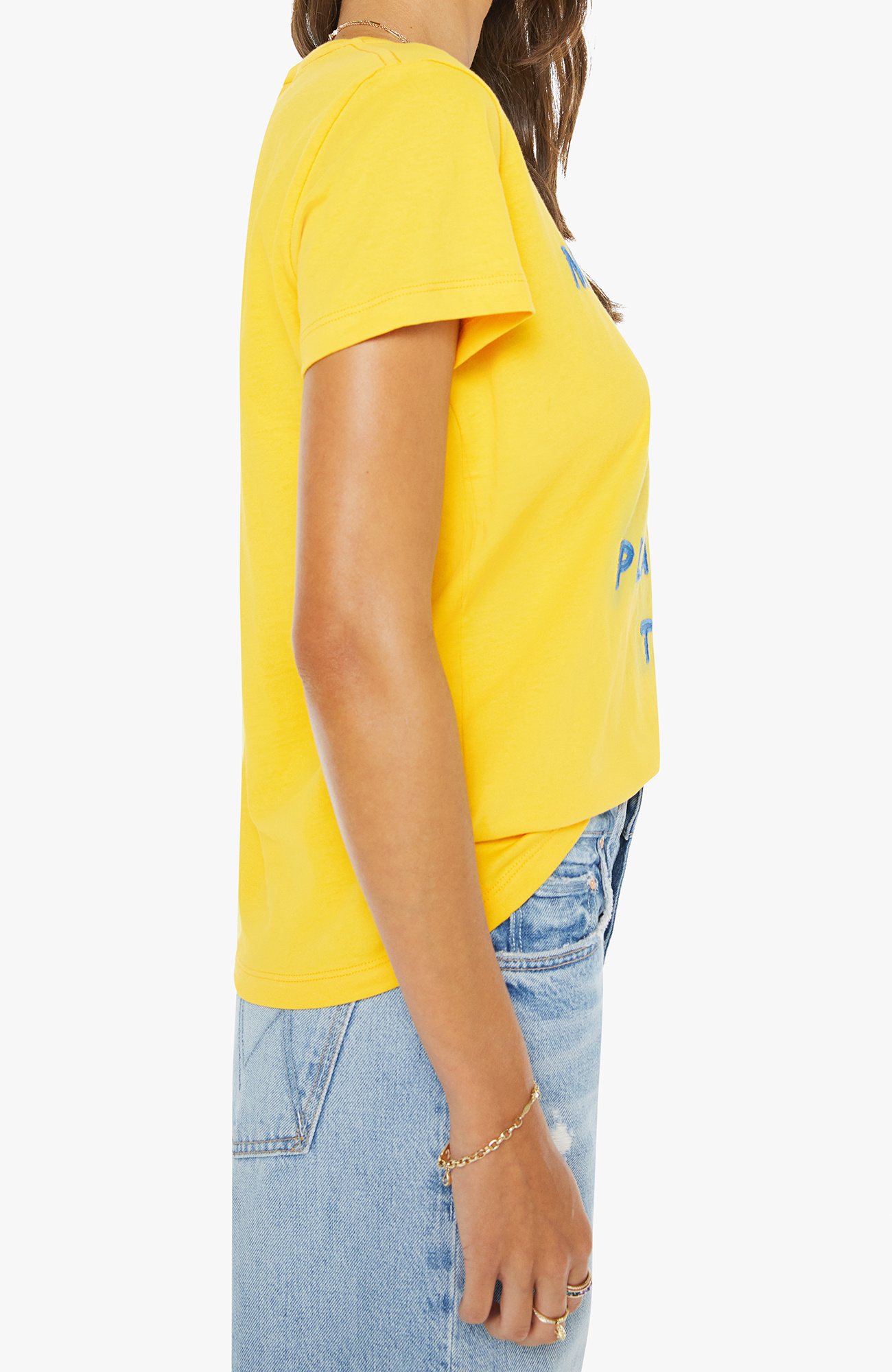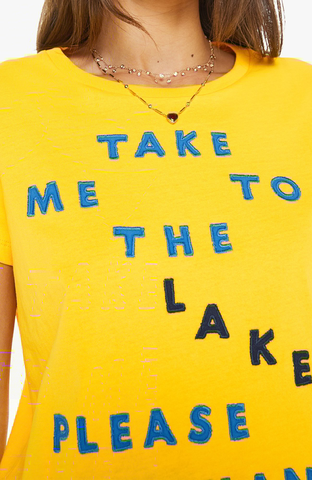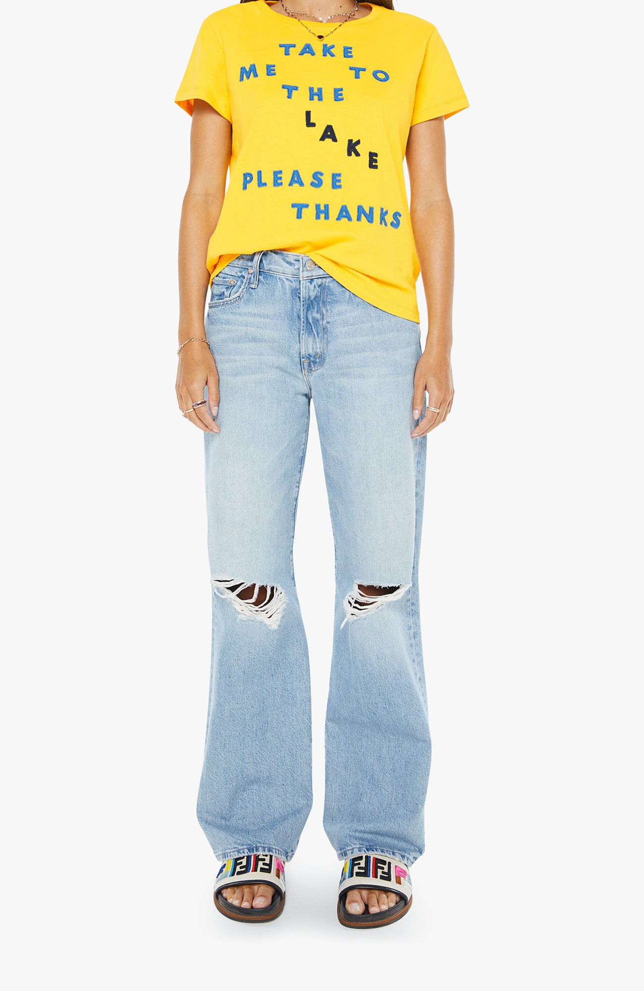 Gone fishin'. A soft crewneck with a slim fit for a vintage look and feel. Made from 100% cotton in yellow, the tee features a blue text graphic on the front.