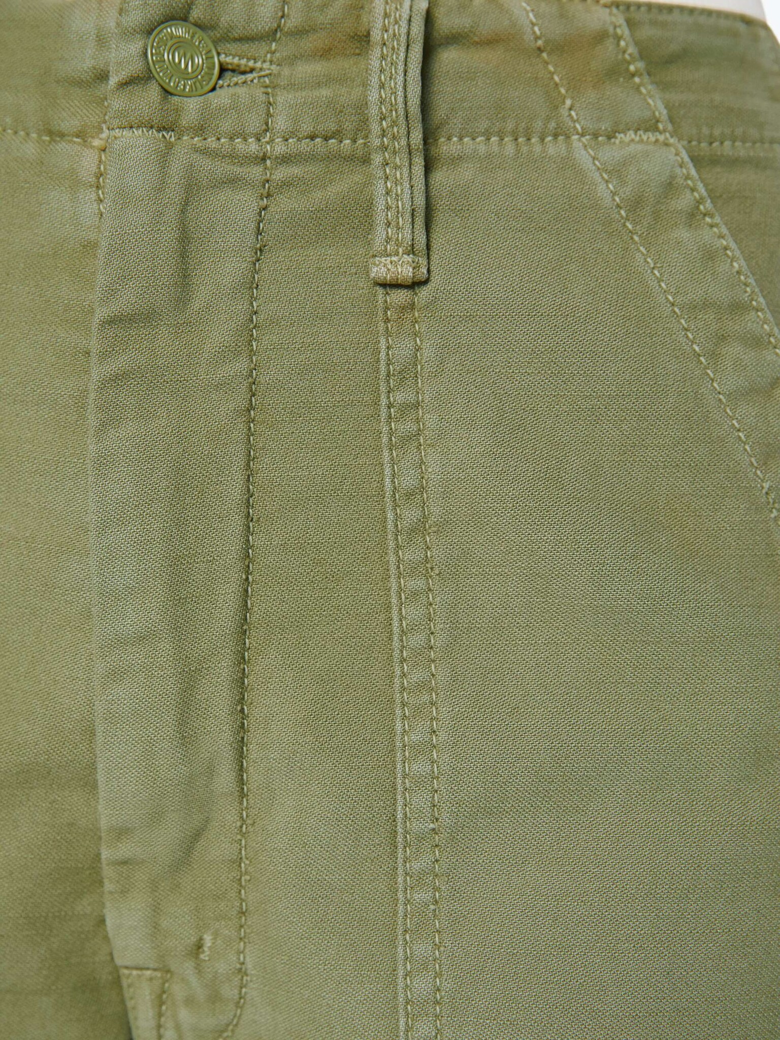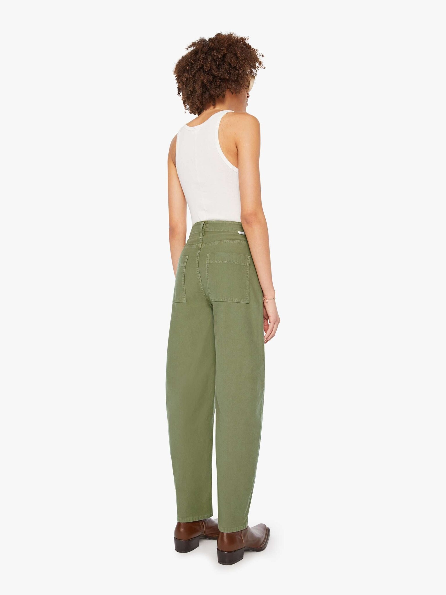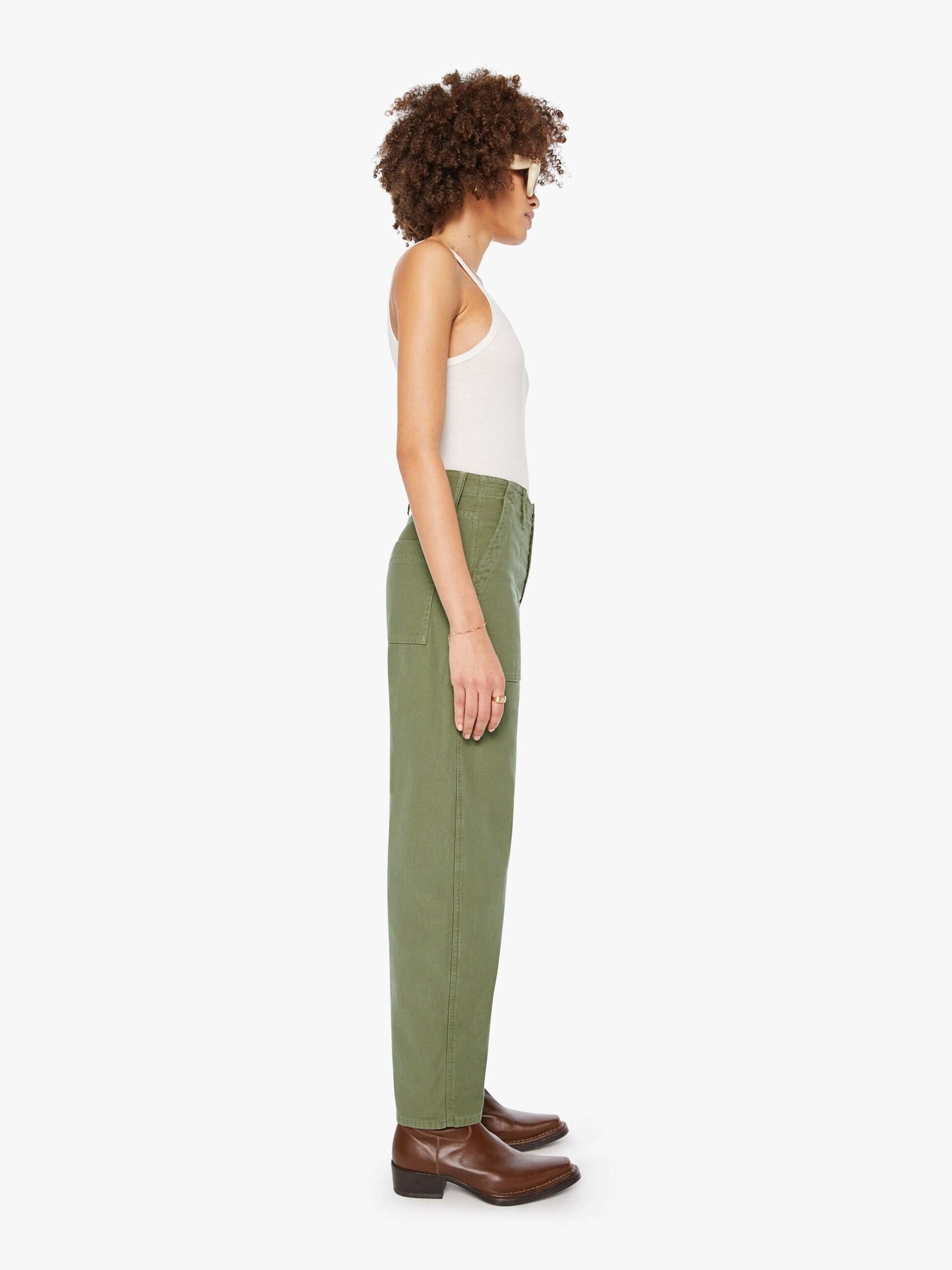 At ease. High-waisted pants with a wide barrel leg, zip fly, oversized patch pockets and a 28.25-inch inseam with a clean hem. Made from rigid 100% cotton, Sir, Yes Sir is a faded army green with tonal hardware.