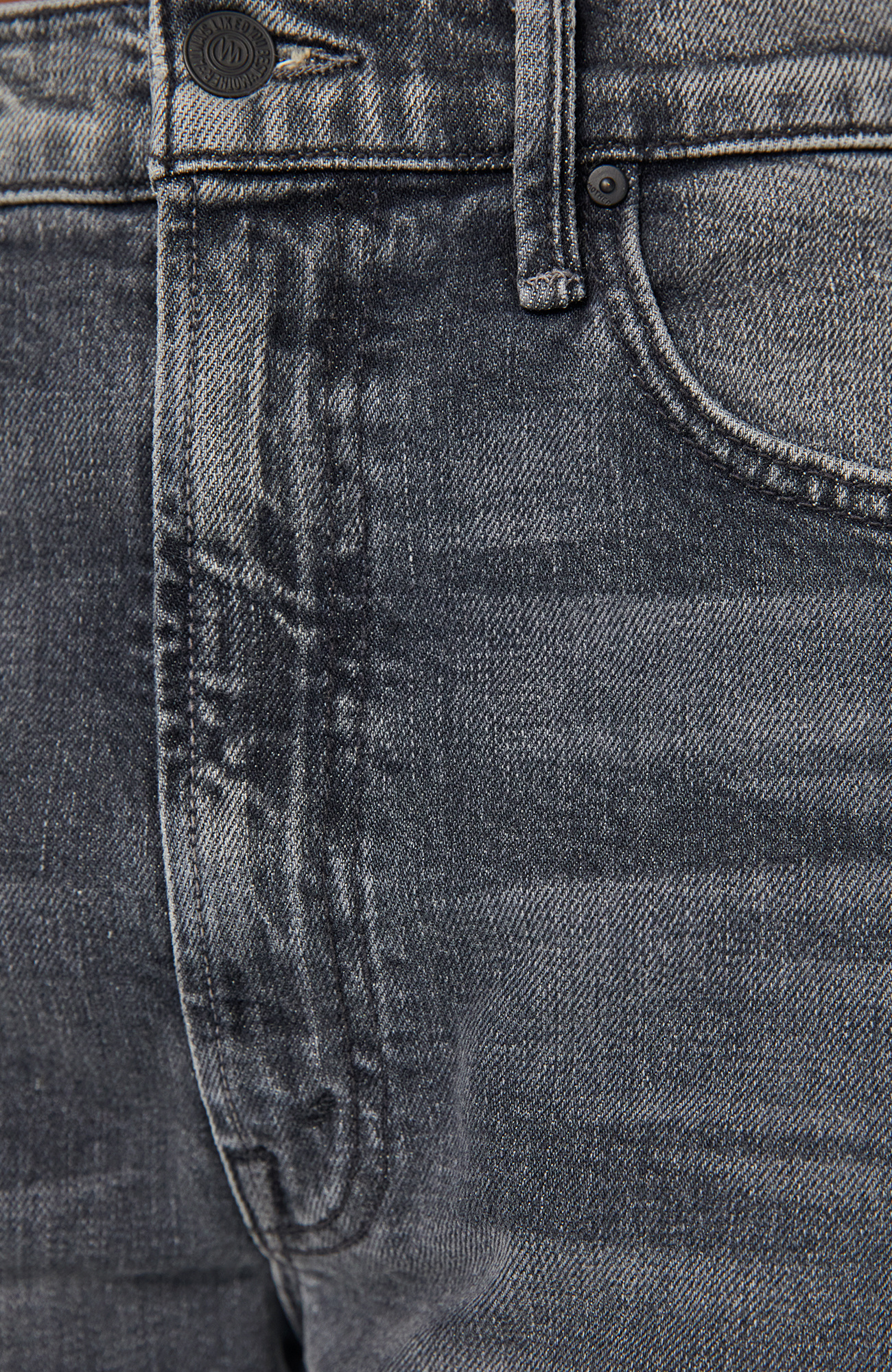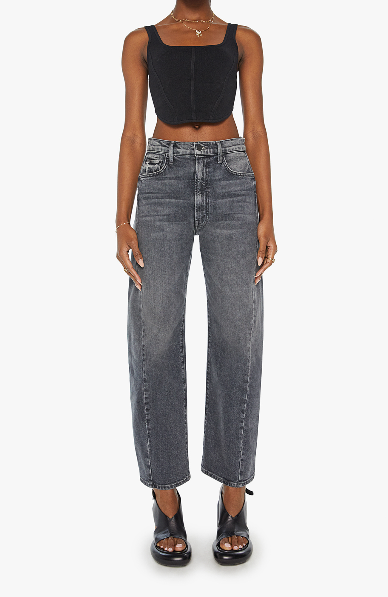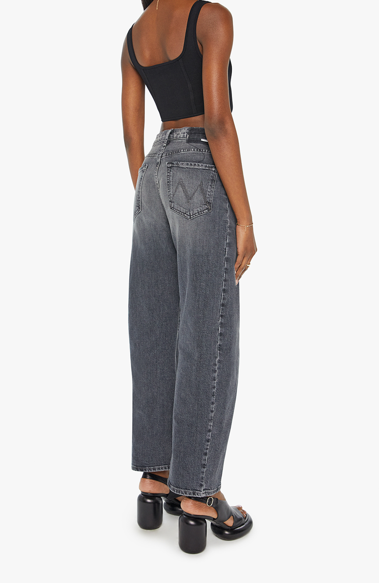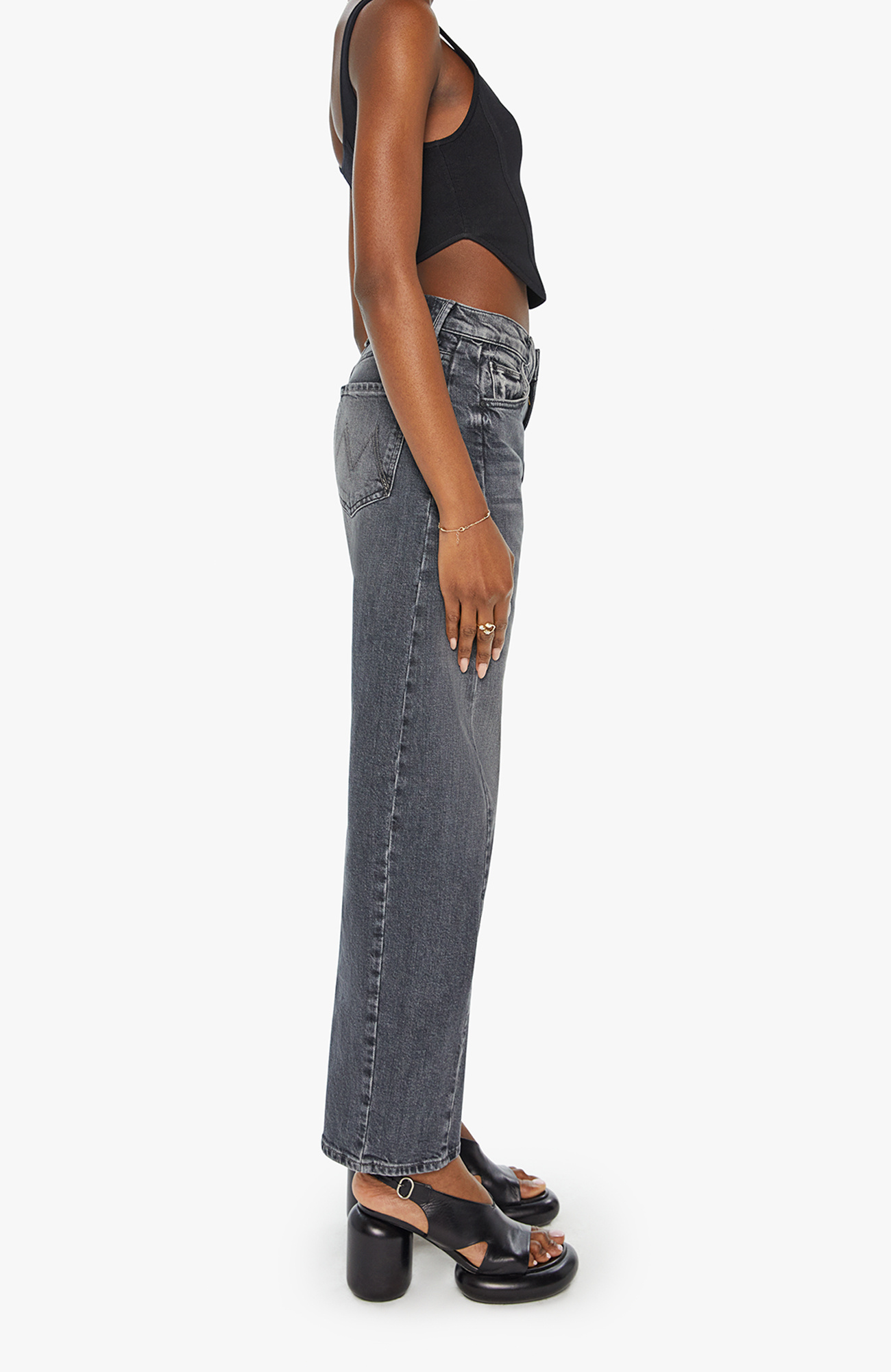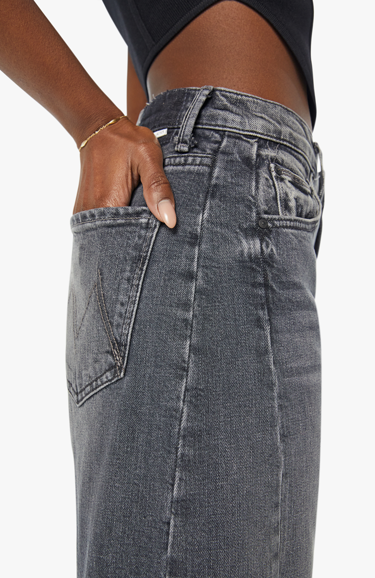 You seeing this? A super high-waisted jean with a wide, curved leg, a 28.25-inch inseam and a clean hem. Cut from semi-rigid SUPERIOR denim, Outta Sight is a dark grey wash with whiskering and fading at the knee.