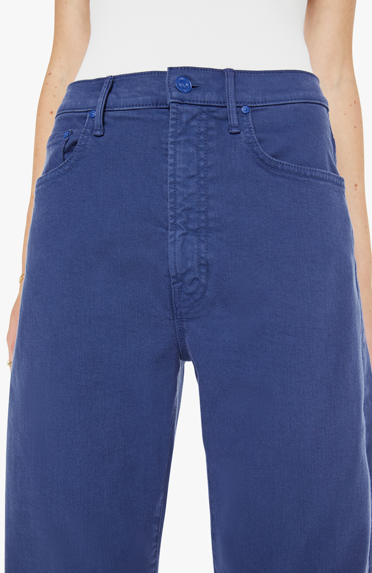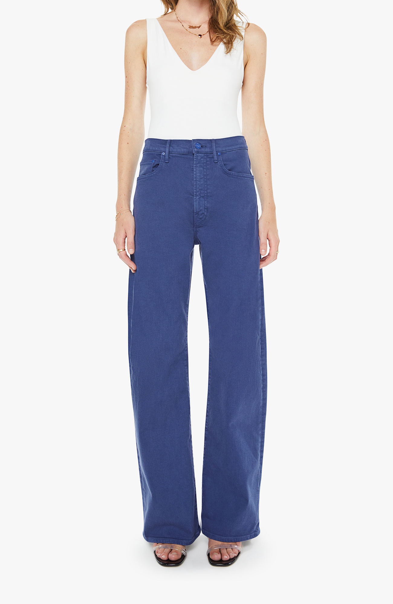 Wide-leg pants with a zip fly, high rise and a 32-inch inseam with a clean hem. Made from a stretch cotton blend, Estate Blue is a dark navy with tonal hardware.