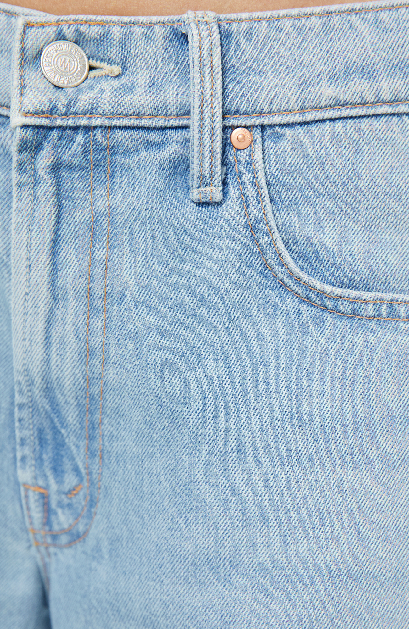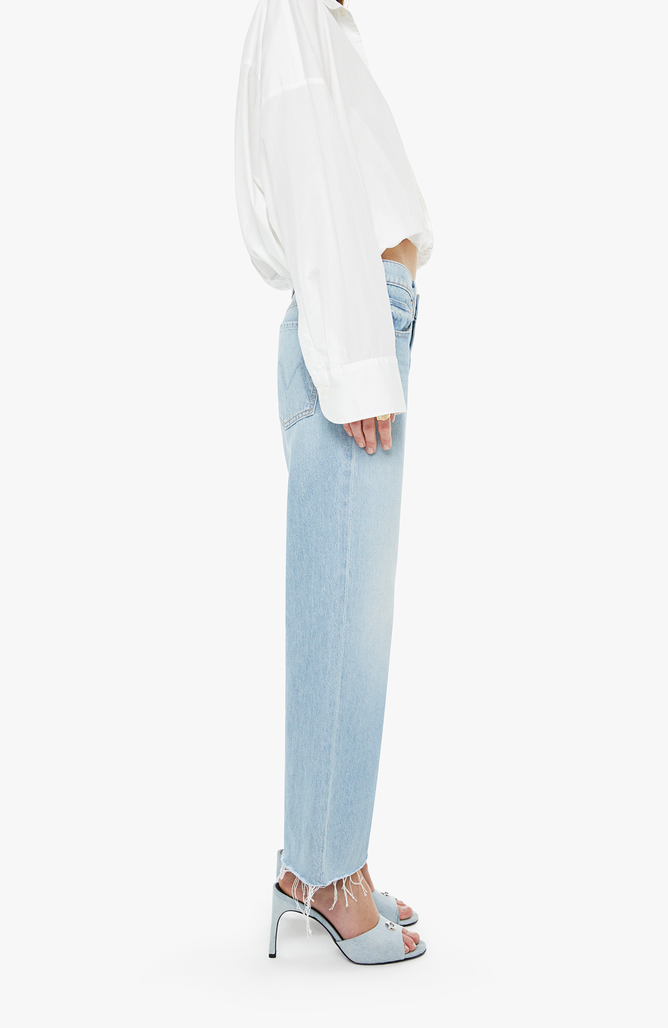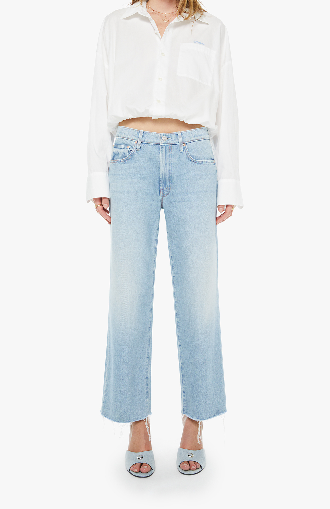 Rare bird. Mid-rise jeans with a wide straight leg, zip fly and frayed ankle-length inseam. Made from rigid SUPERIOR denim with a lightweight, drapey feel, Few And Far Between is a light blue with subtle whiskering and fading.