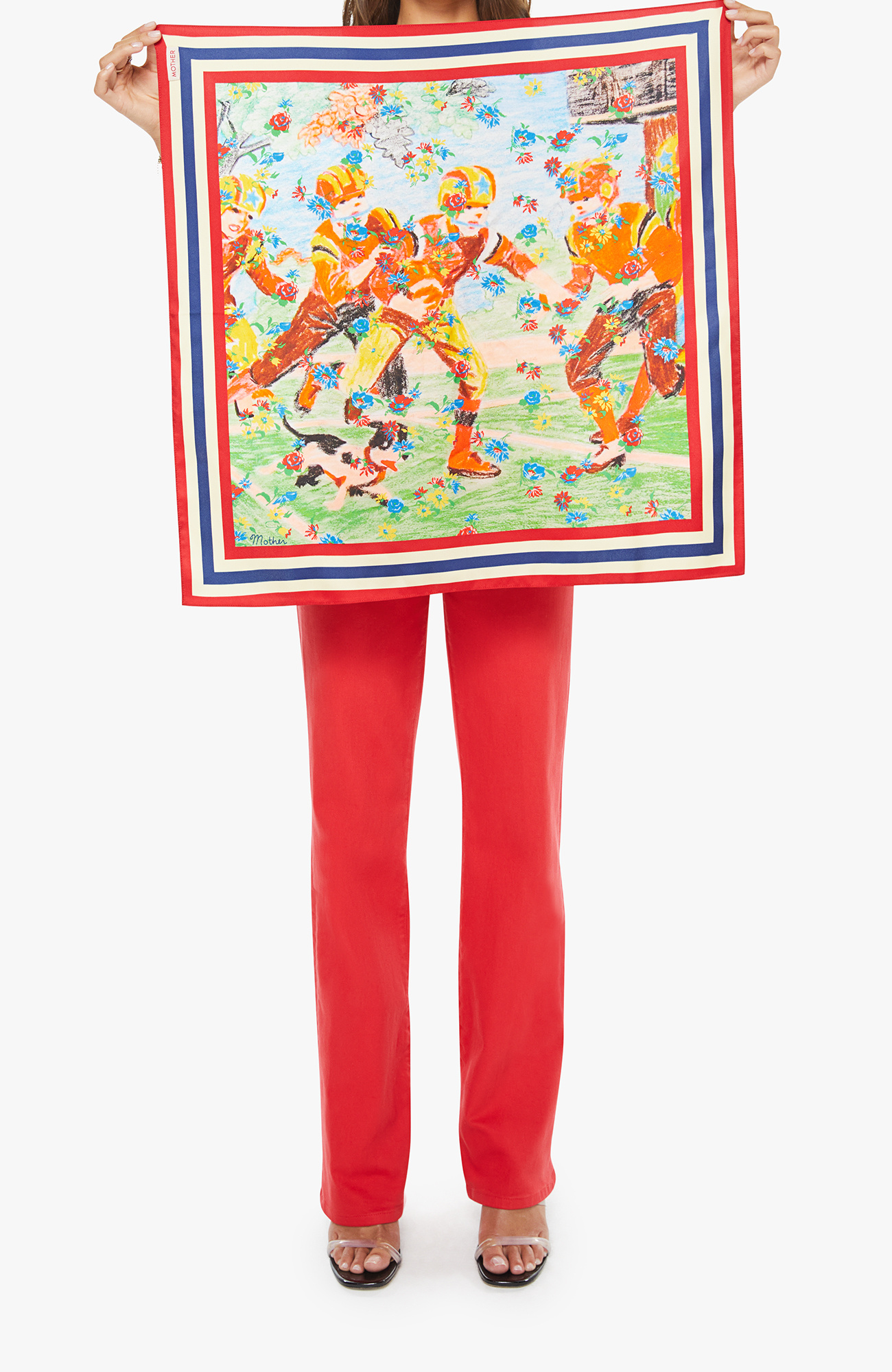 Don't drop the ball. A 25" square scarf made from 100% silk with a football-inspired graphic and red, white and blue striped trim.