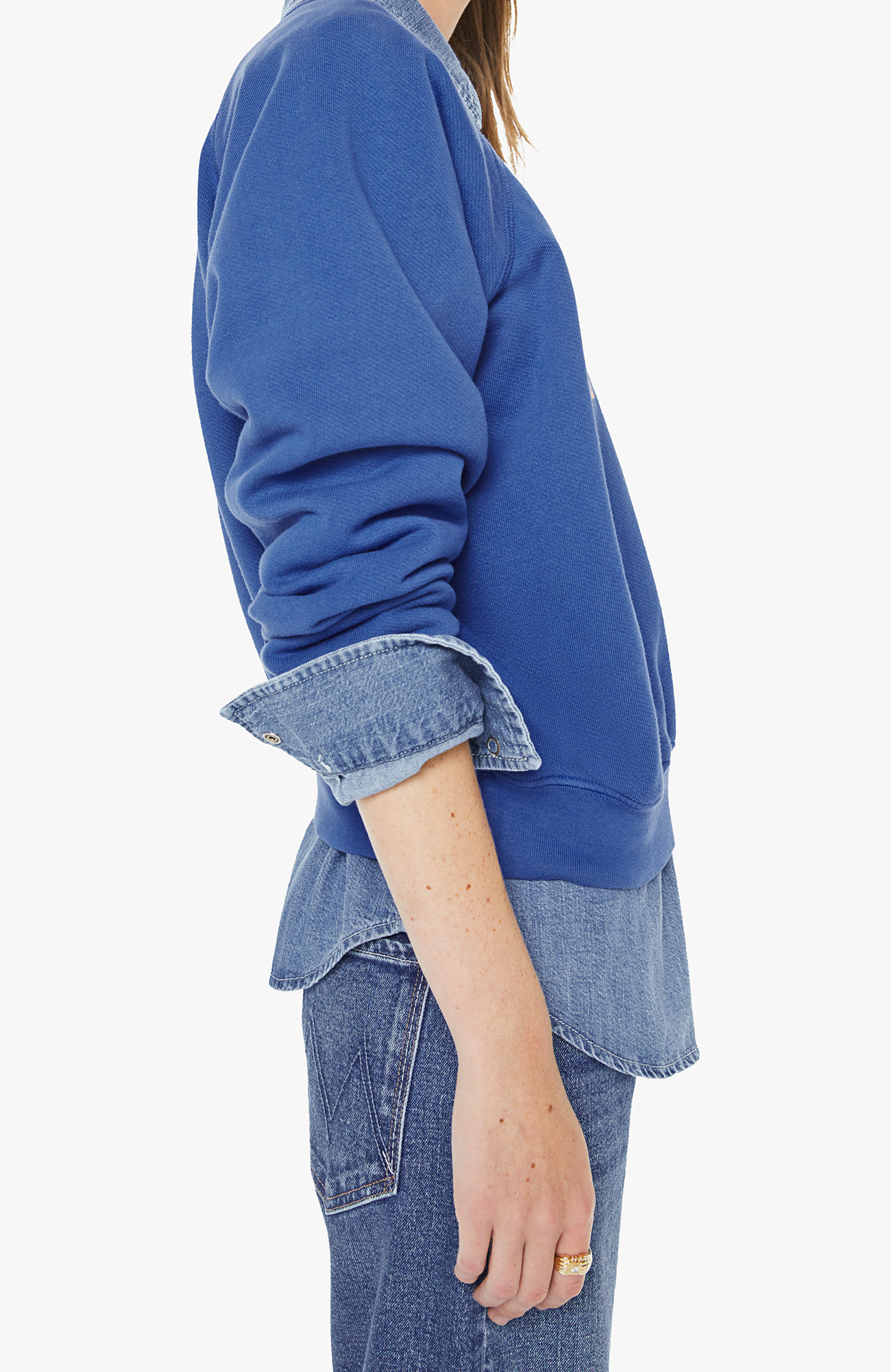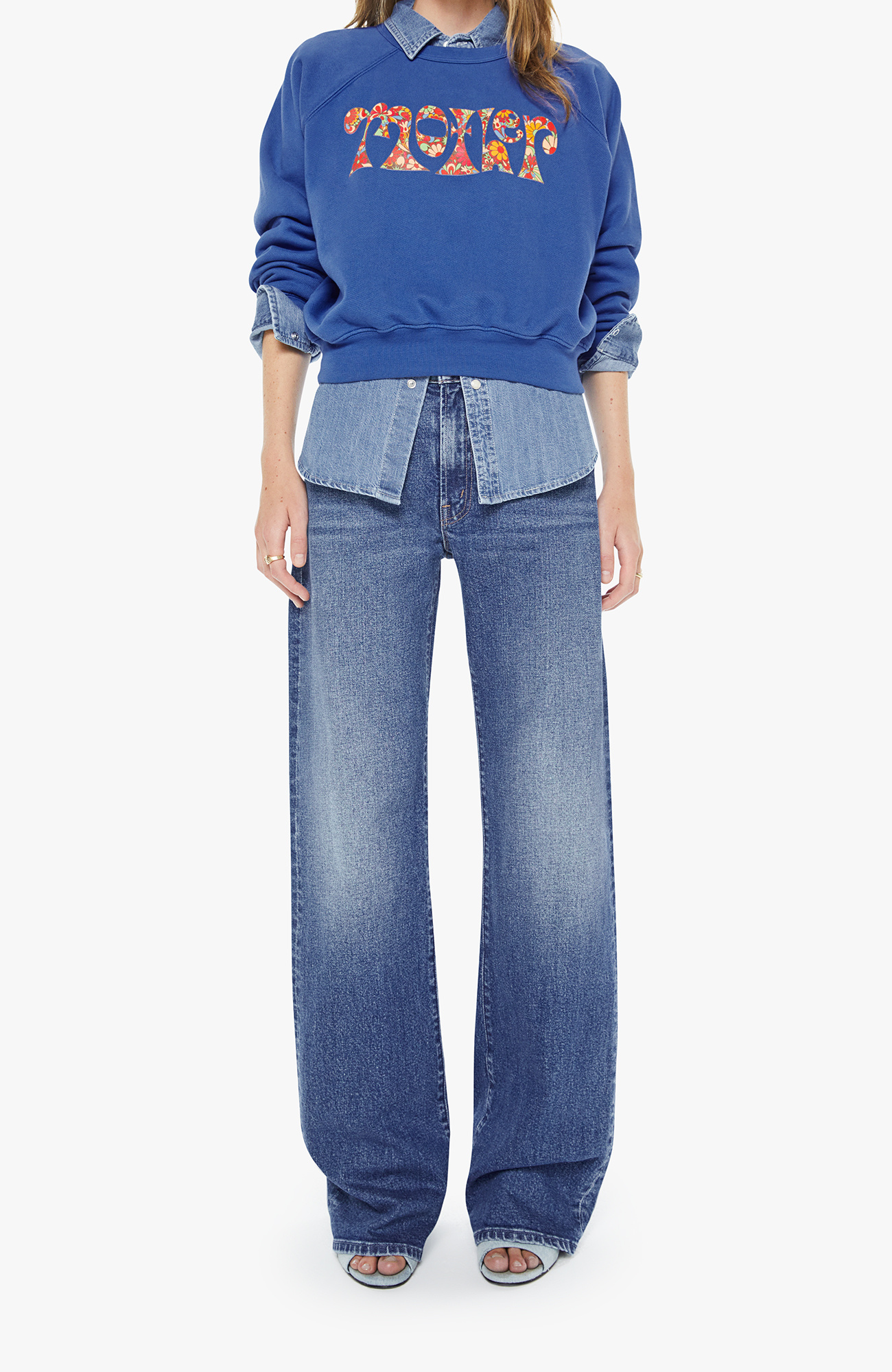 Petal power. A raglan sweatshirt with a crewneck, ribbed hems and a slightly cropped fit. Made from super-soft 100% cotton, the sweatshirt is designed in blue with MOTHER's name in floral block text on the front.