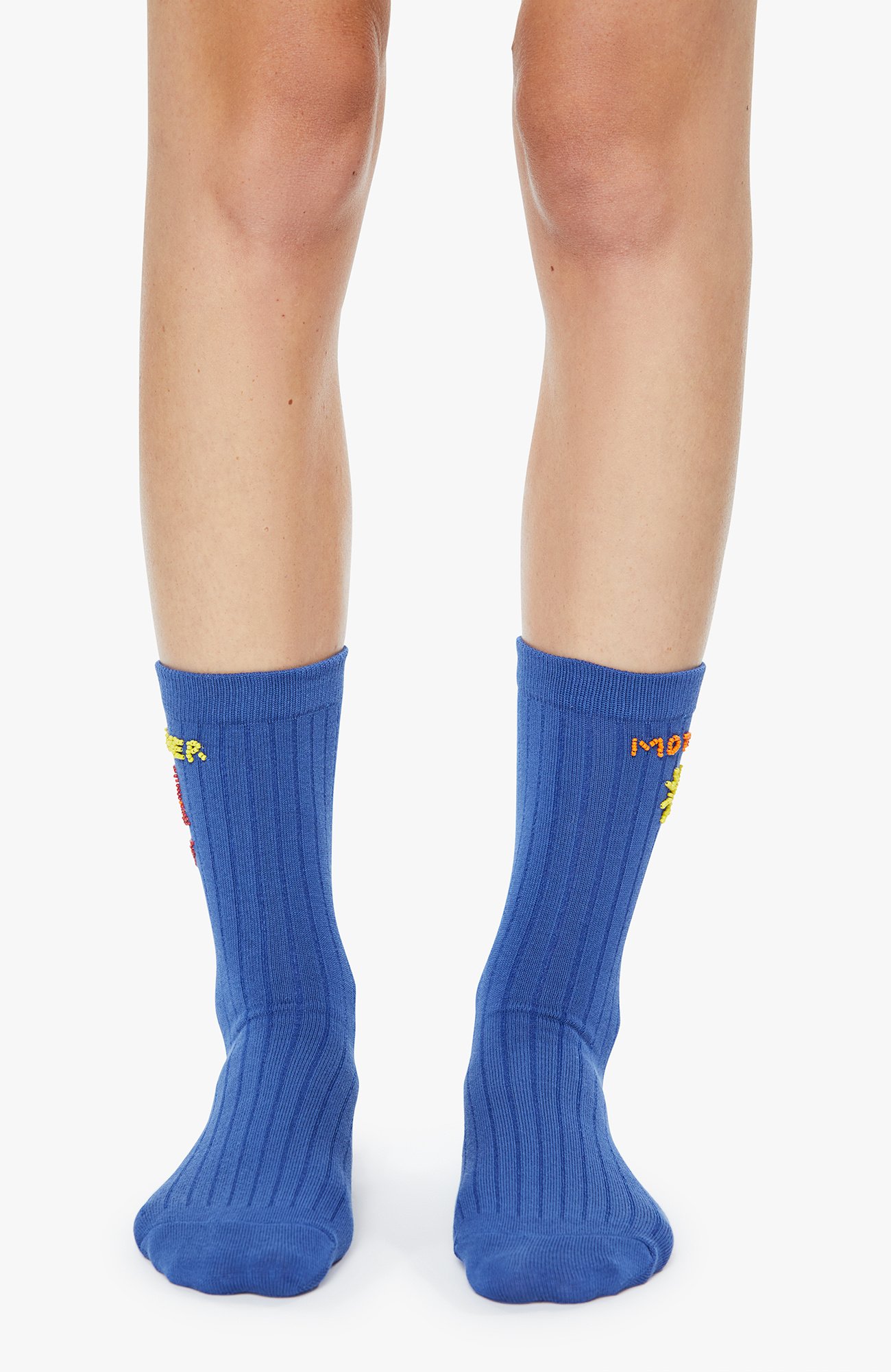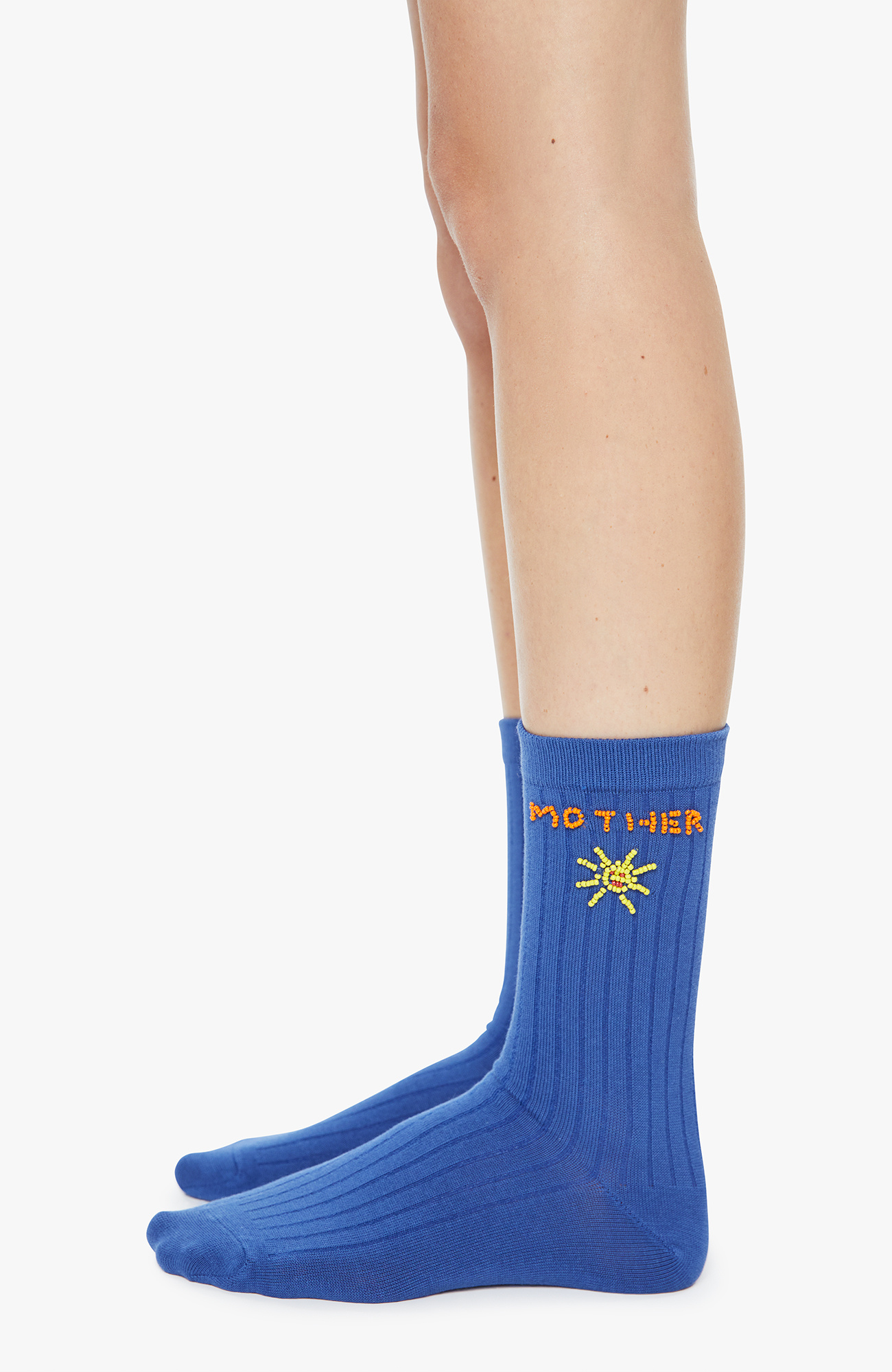 Sun's out. Tube socks designed in blue with a sun, red bikini and MOTHER's name beaded on the sides.