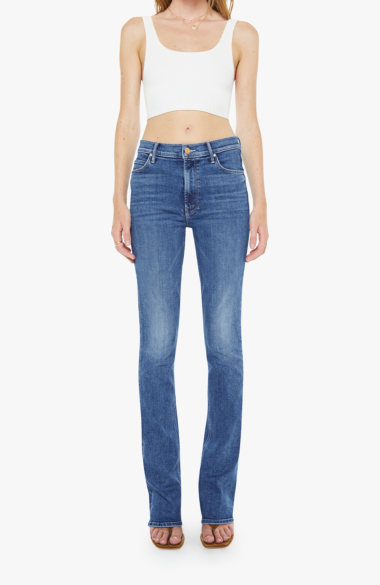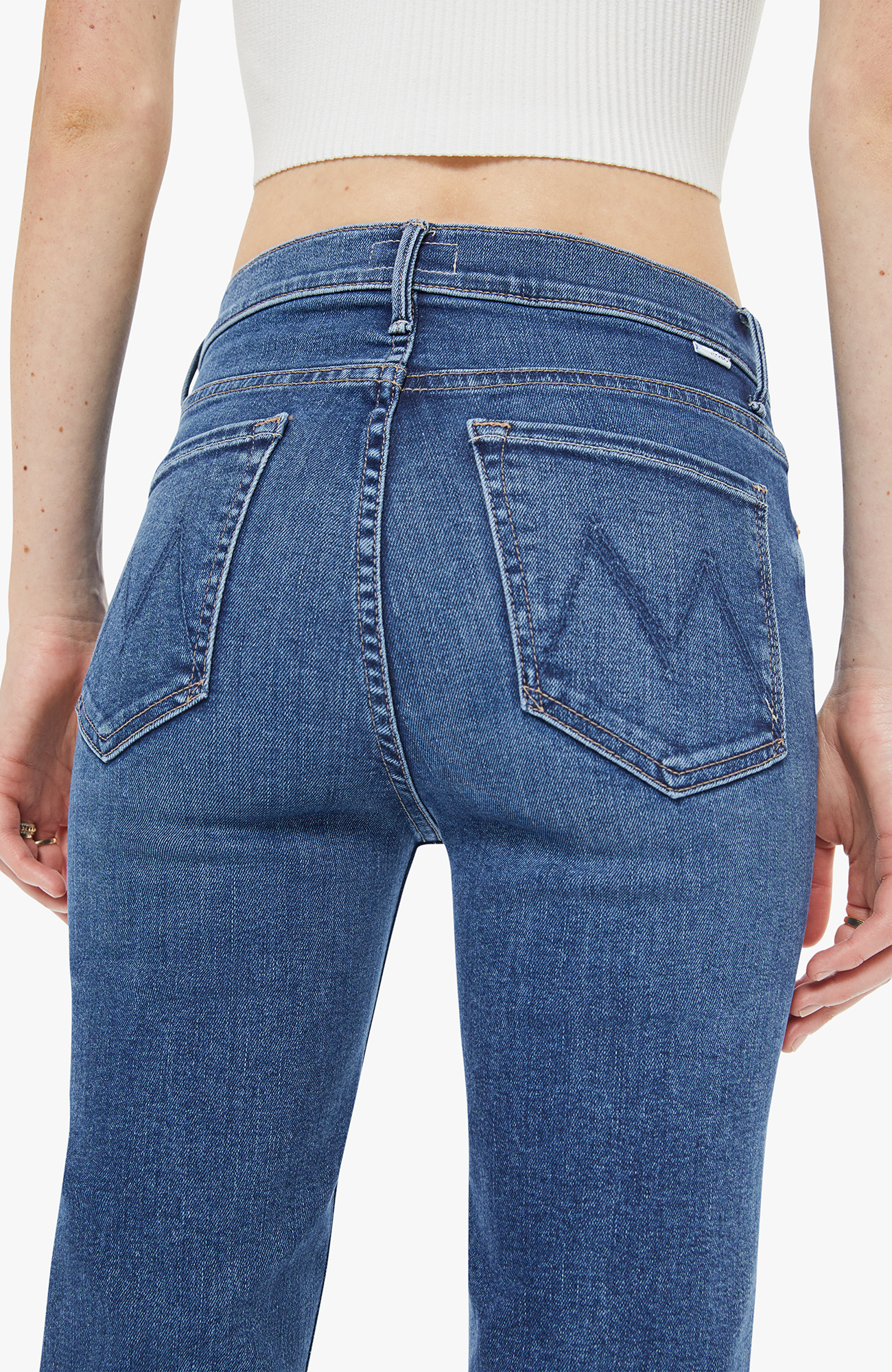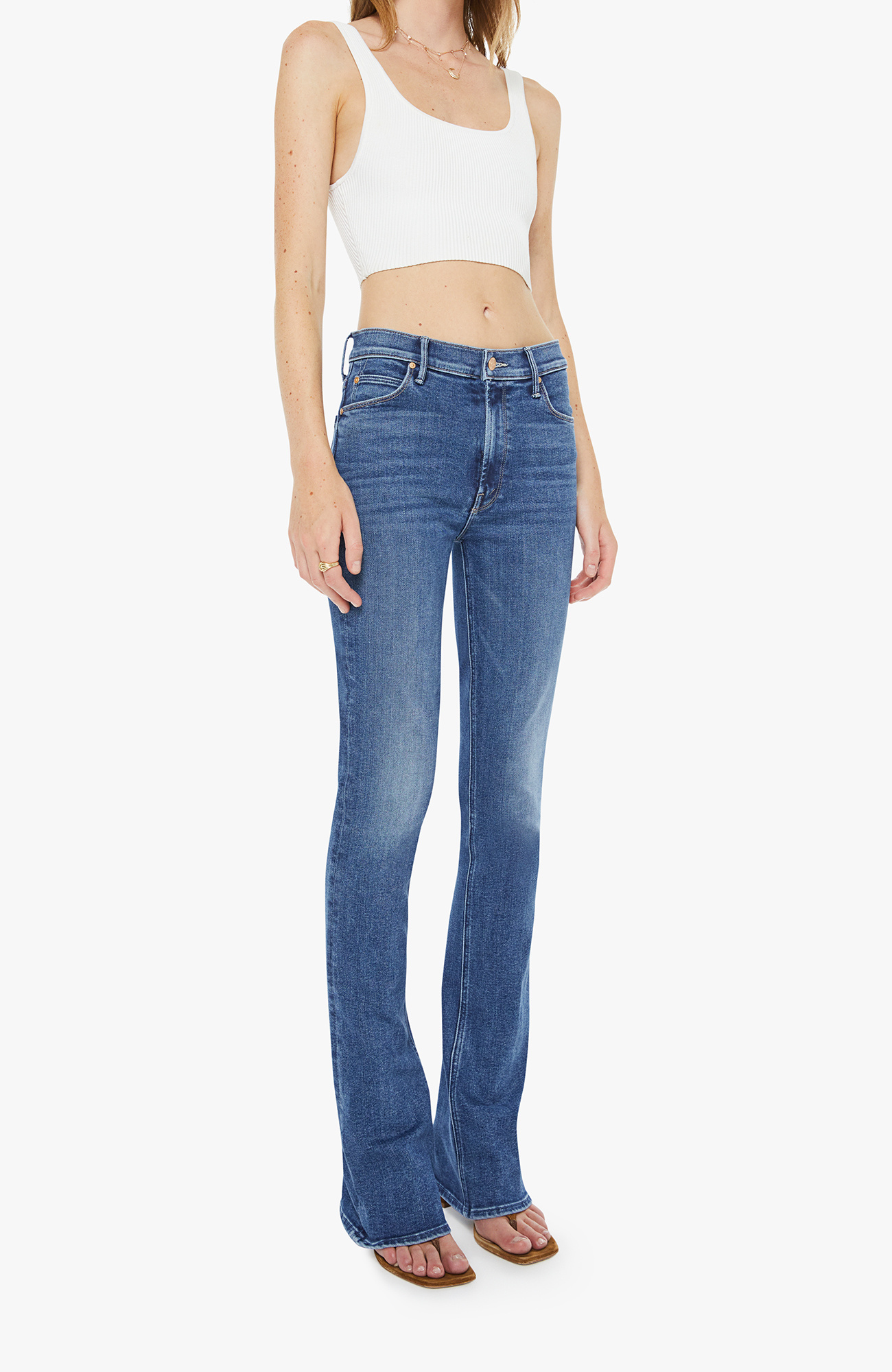 Hidden treasure. A classic skinny flare with a mid rise, zip fly and a long 34-inch inseam with a clean hem. Made from stretch denim, Prized Possession is a mid blue with subtle whiskering and fading at the knees.