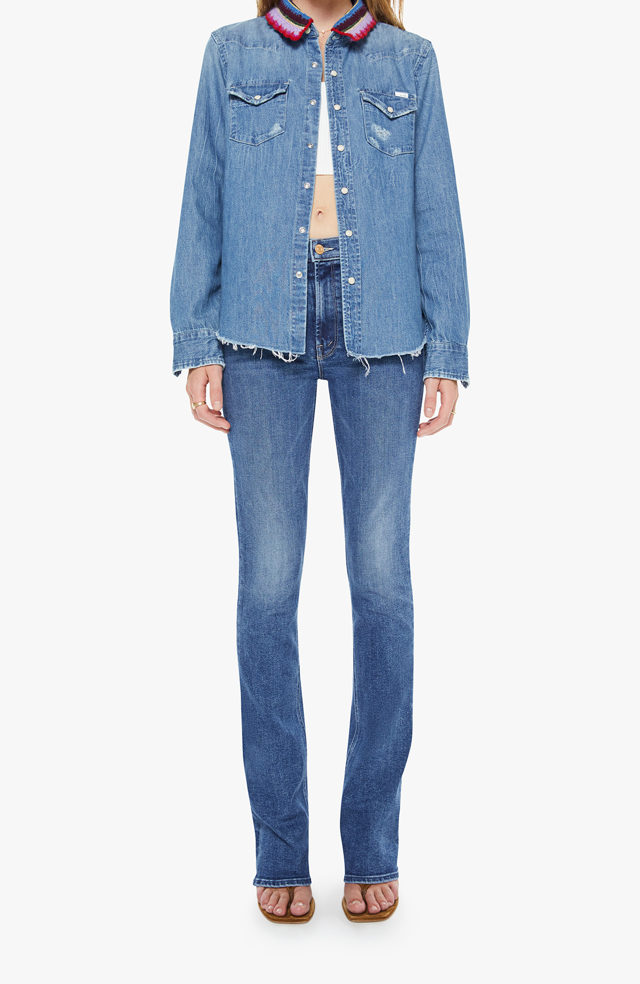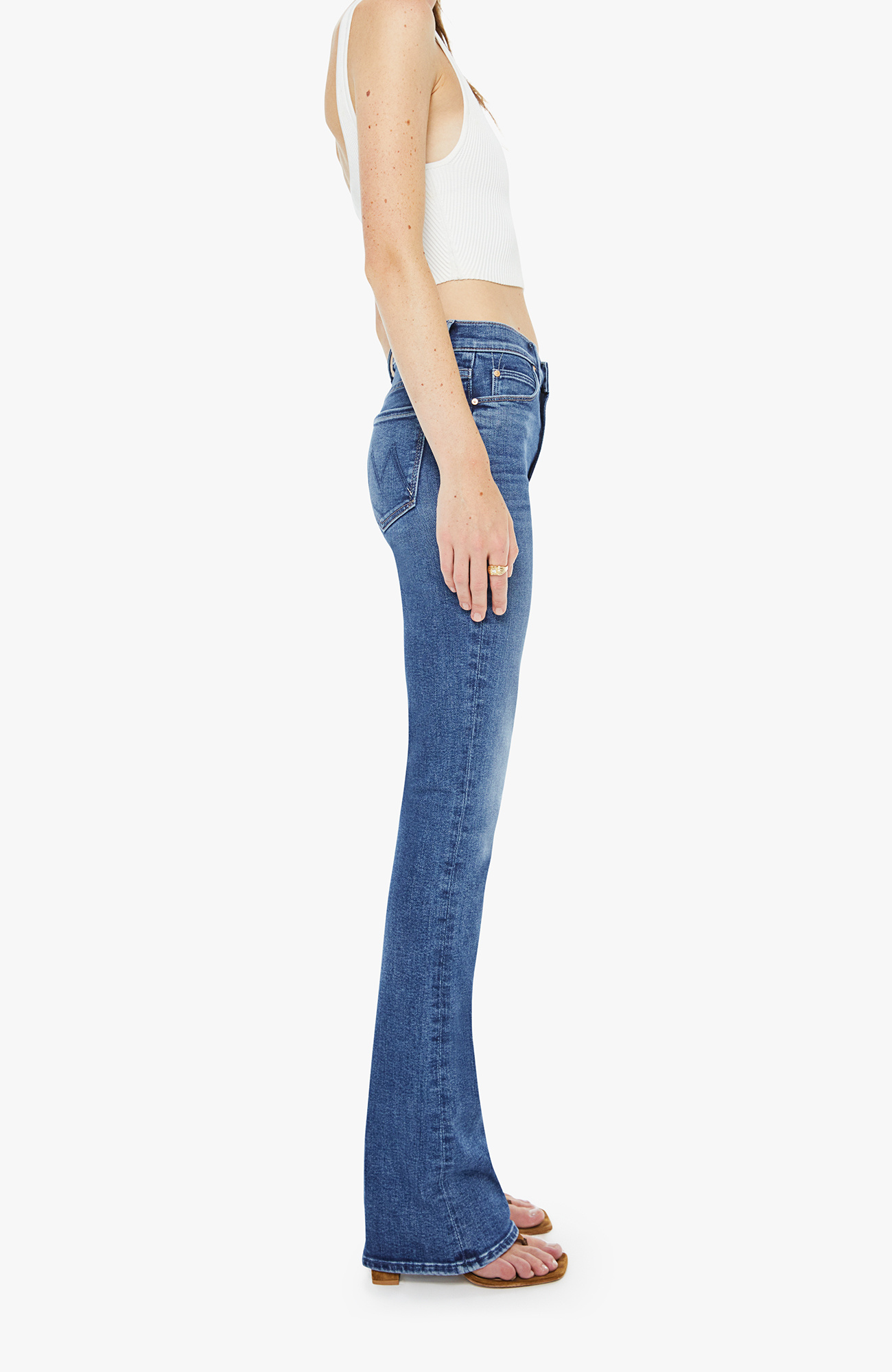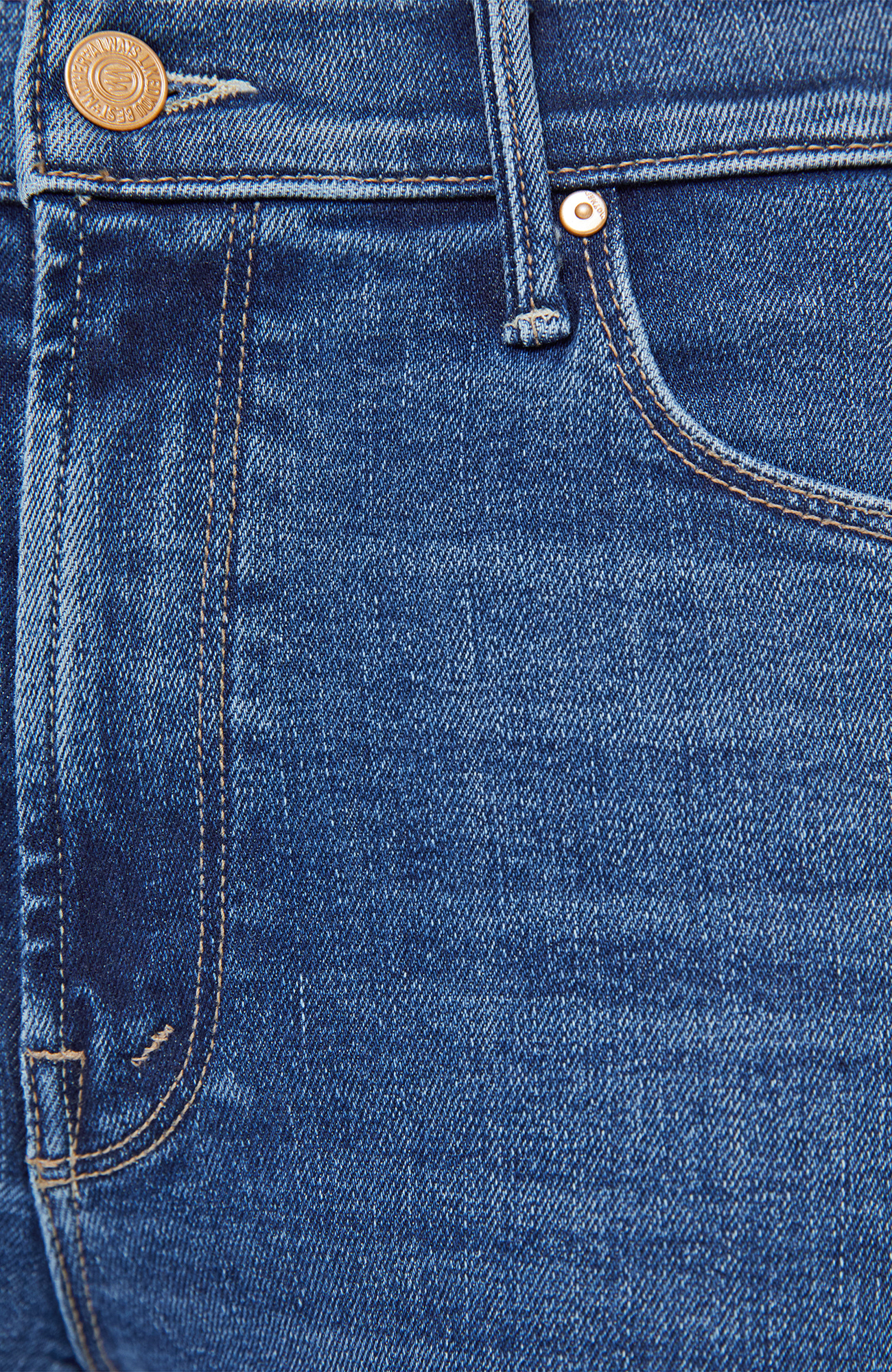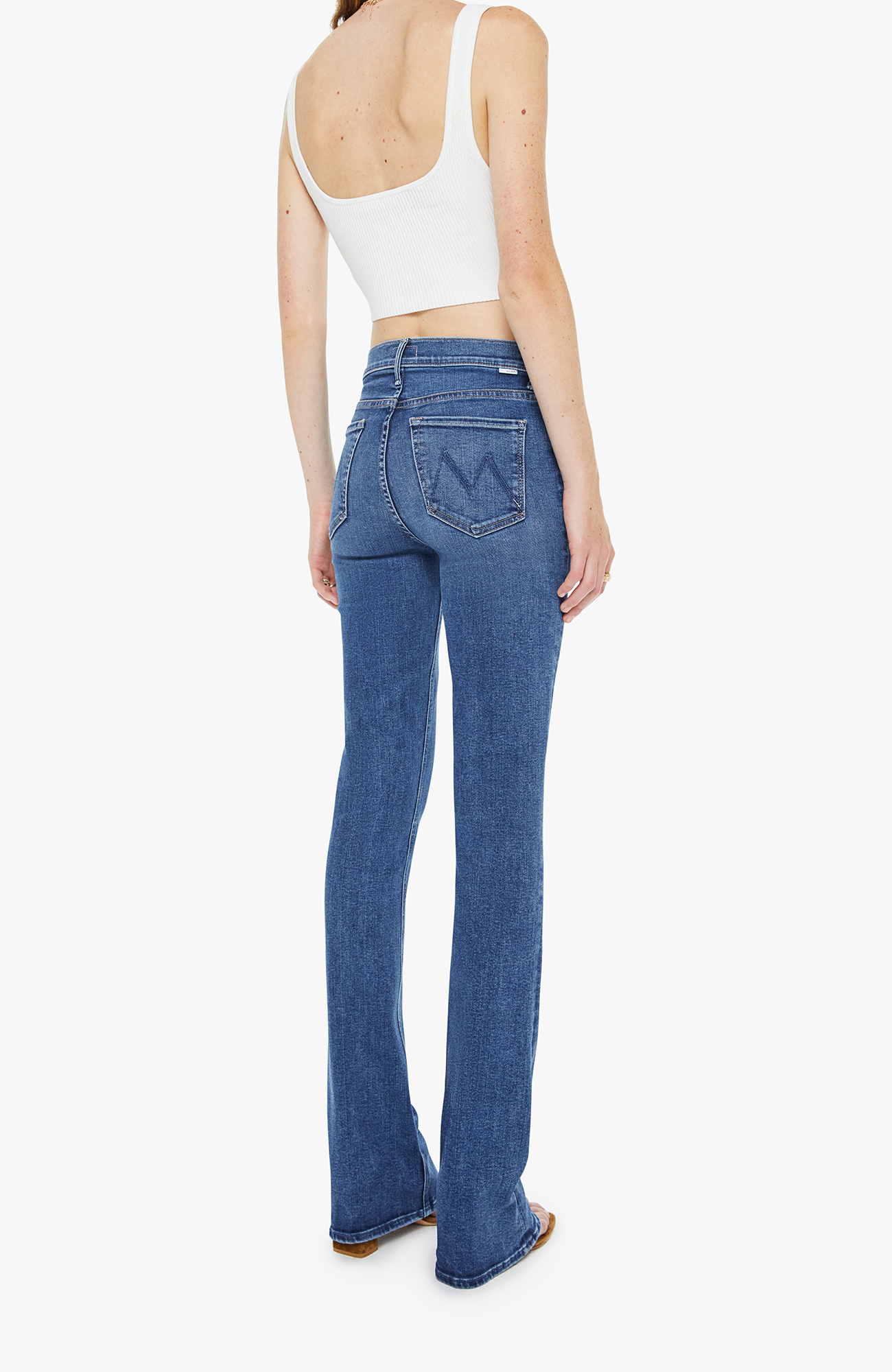 Hidden treasure. A classic skinny flare with a mid rise, zip fly and a long 34-inch inseam with a clean hem. Made from stretch denim, Prized Possession is a mid blue with subtle whiskering and fading at the knees.