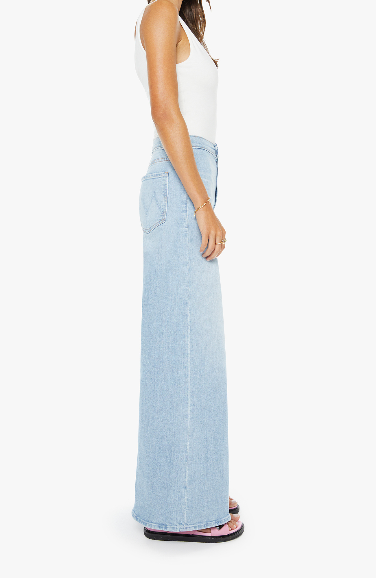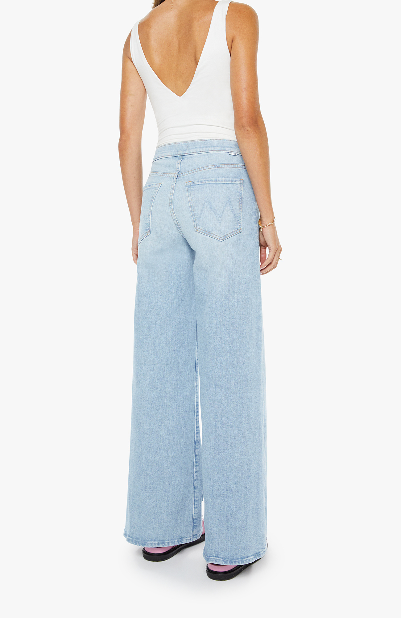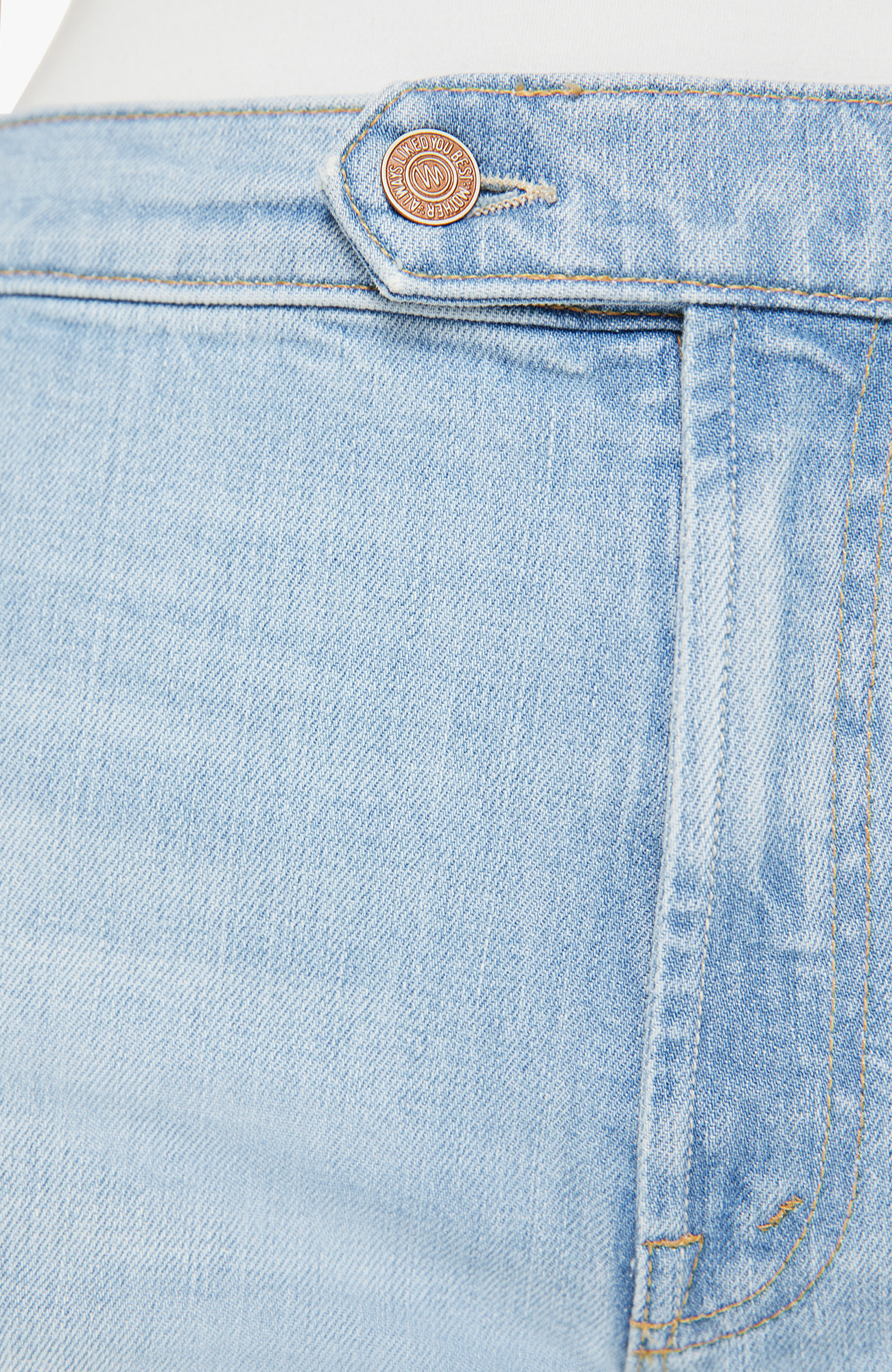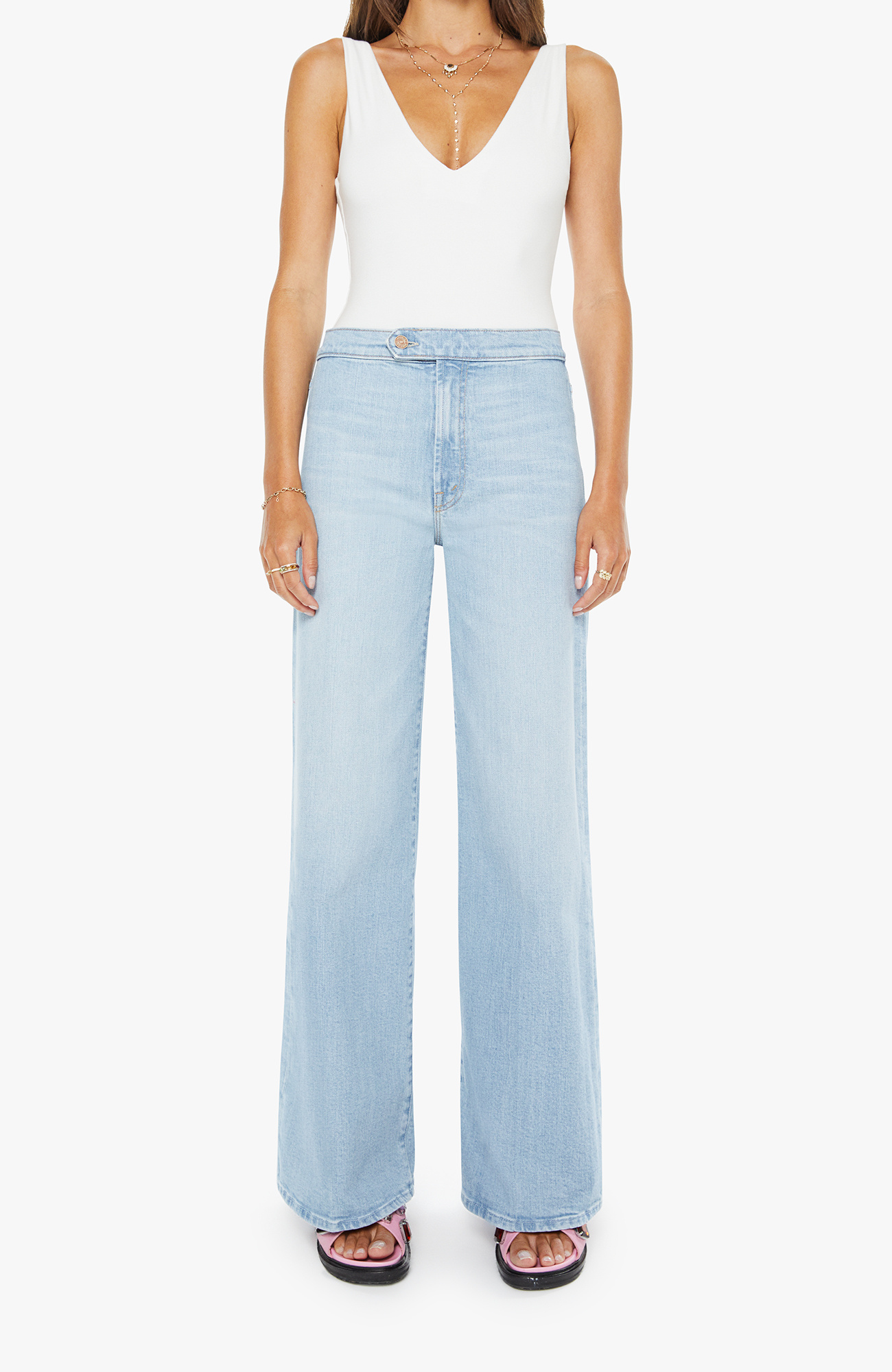 Chosen one. Wide-leg pants with a high rise, zip fly, tabbed waistband, long 31-inch inseam and a clean hem. Made from denim with a touch of stretch, You're My Favorite is a light blue with subtle whiskering and fading at the knee. MOTHER's go-to.