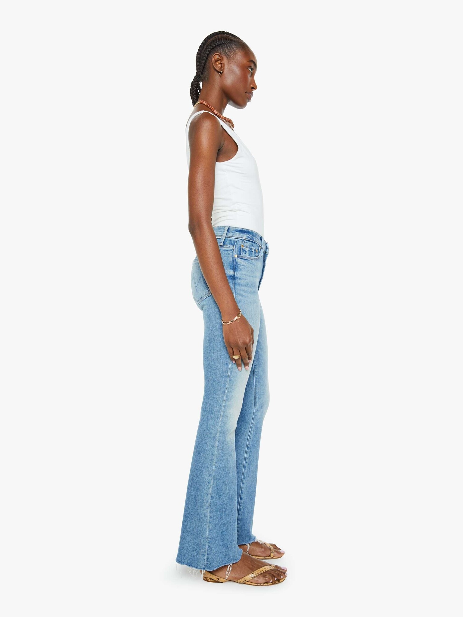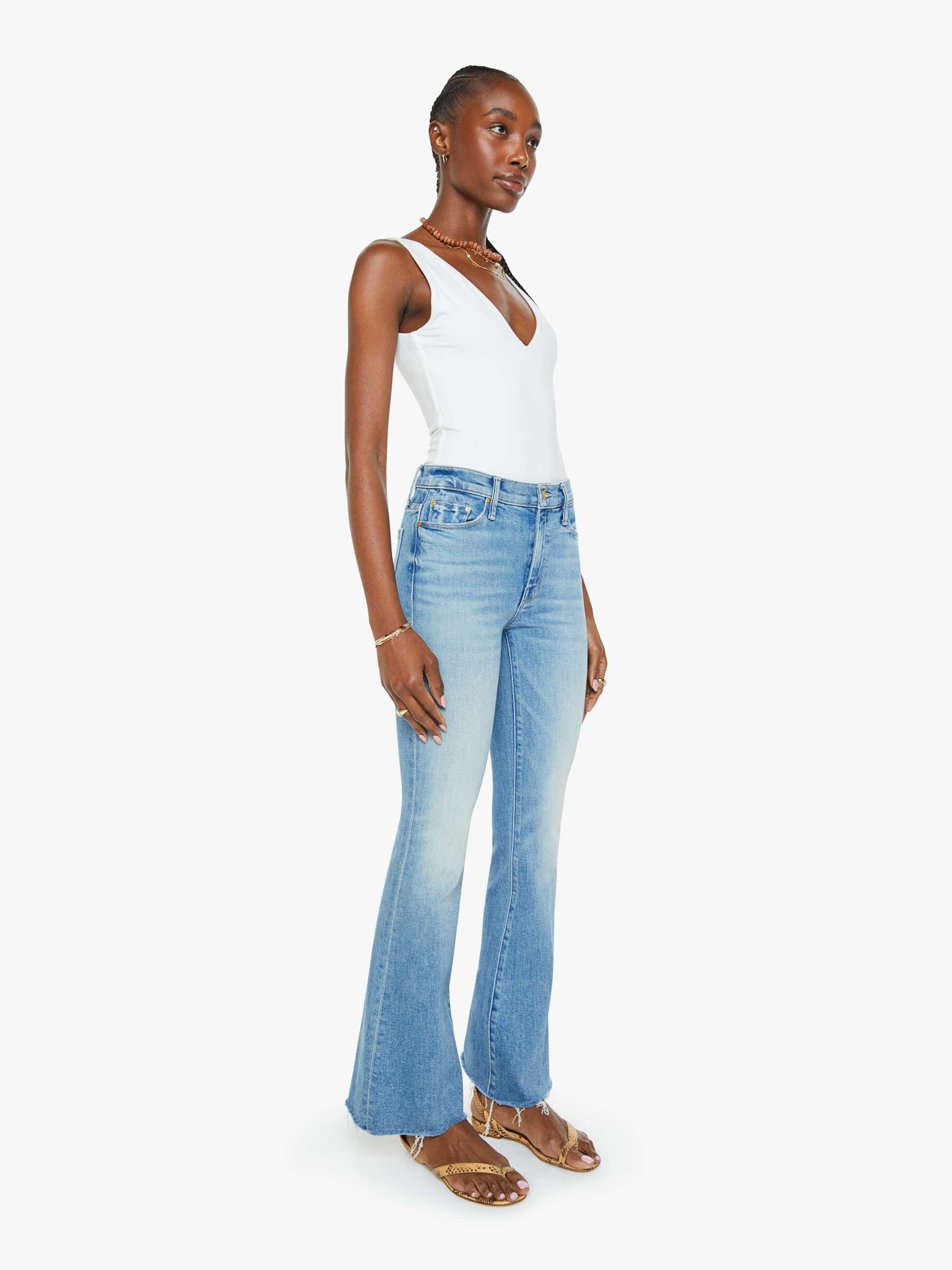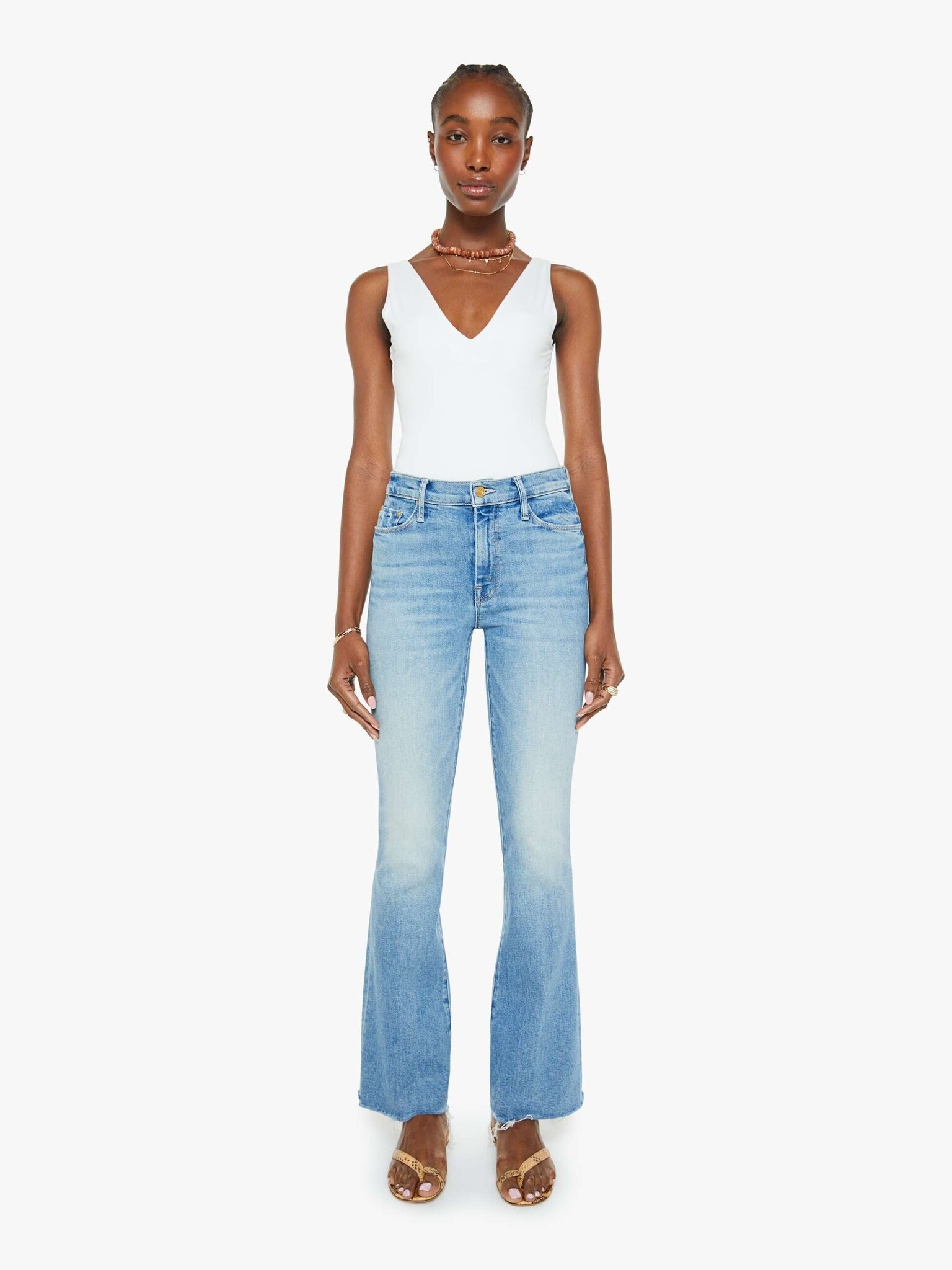 Sunkissed. This popular mid-rise flare has a 31-inch inseam with a frayed hem. Cut from stretch denim, Glow Up is a light blue with whiskering and fading.