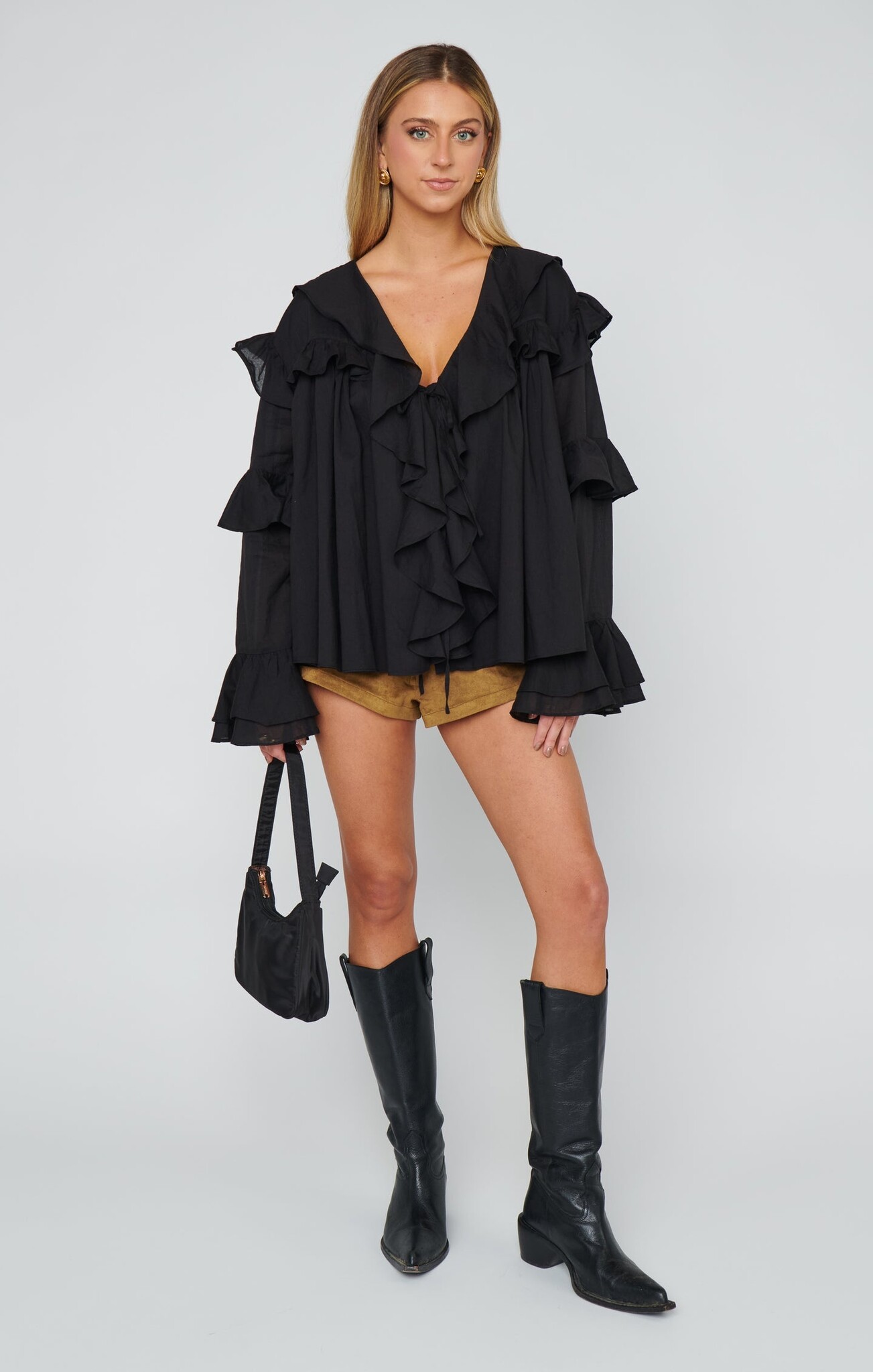 The Joss Ruffle Top is your new boho go-to! With a floaty oversized fit and billowy bell sleeves, it's made for easy days. With soft ruffle trims and a breezy flyaway hem, it’s equal parts femme and relaxed.