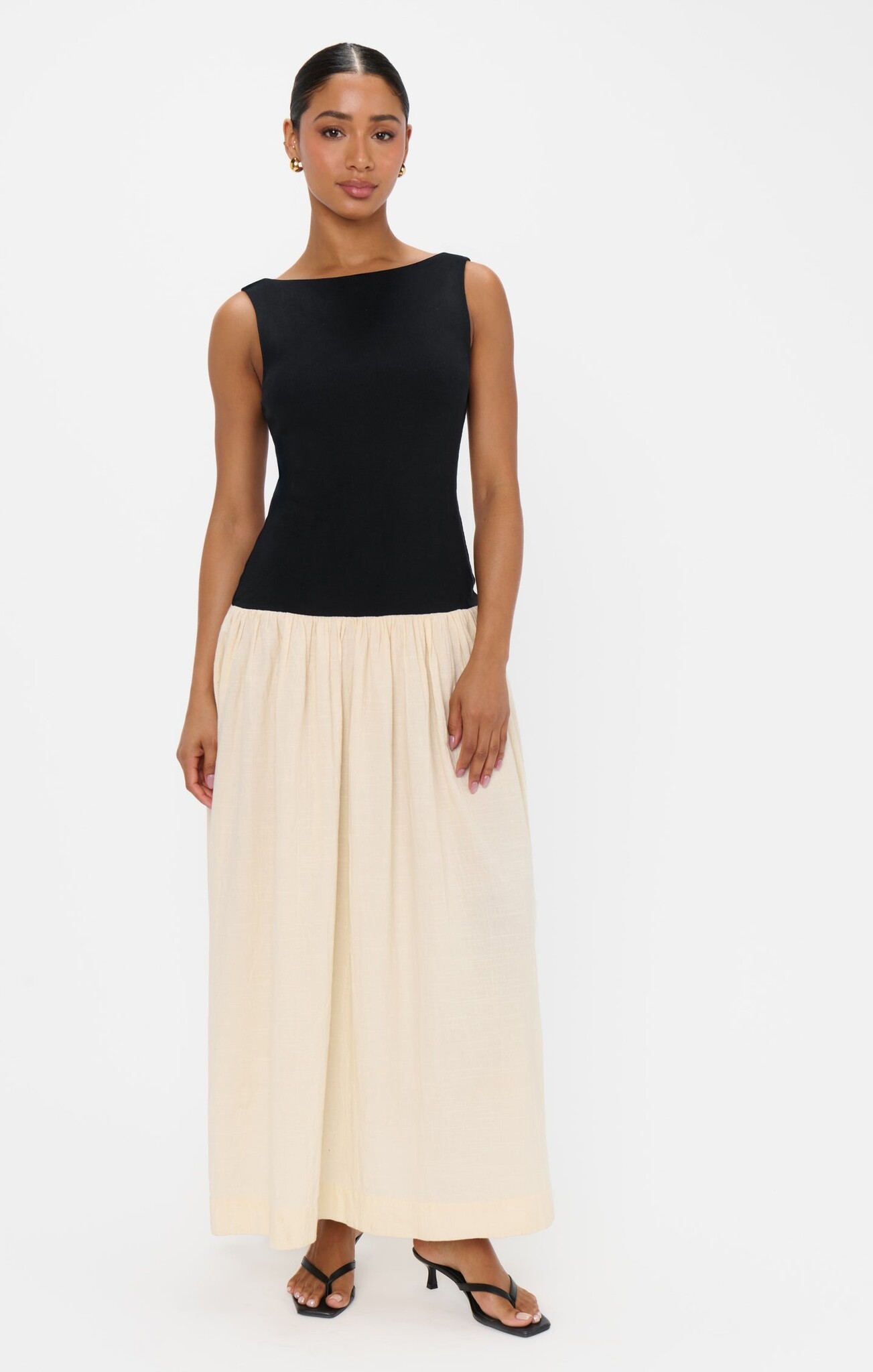 This boatneck dress pairs a curve hugging, second-skin–like bodice with an airy cotton skirt for a contrast moment that feels light and breezy. The perfect throw on style for sunny days, weekend plans, and everything in between.