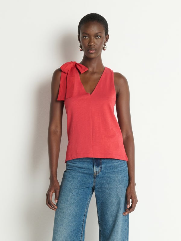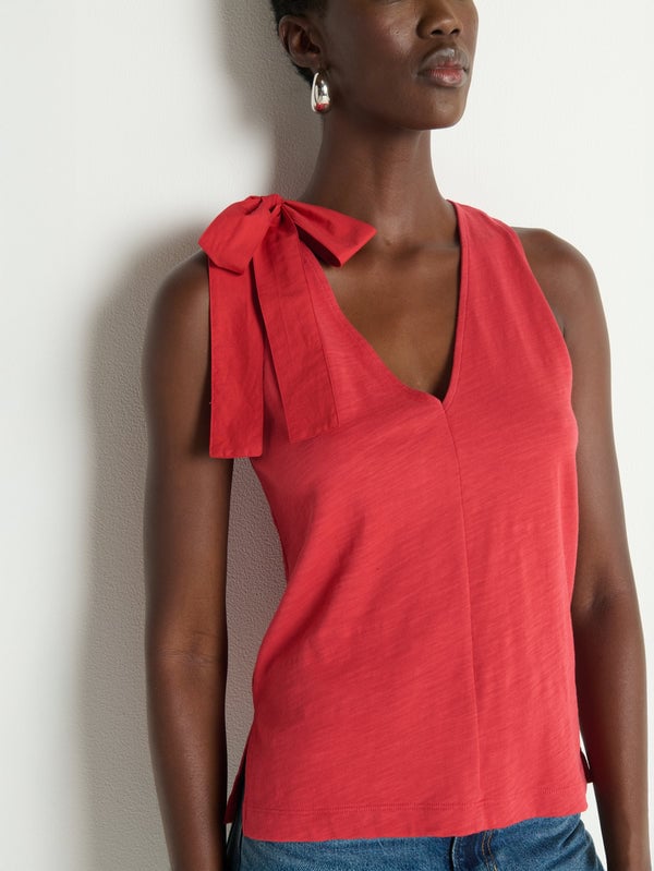 Made of soft cotton jersey, the Daniella Tank brings a playful touch to your wardrobe. A bow detail at the shoulder and a V neck give this sleeveless top a hint of charm and personality.