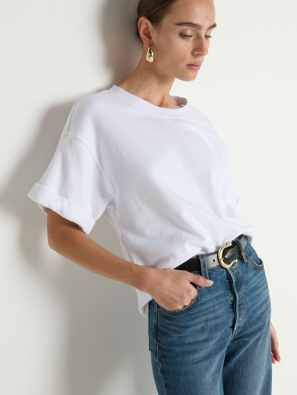 An oversized sweatshirt-tee with rolled boxy cuffs and an effortlessly relaxed fit. Perfect for those sunny spring days that are both warm and cool.