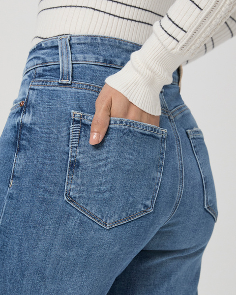 This modern high-waisted wide leg has a slightly relaxed fit and an ankle length silhouette. This style is cut from Paige Vintage denim and comes in a classic light wash with vintage-inspired details and a raw hem.