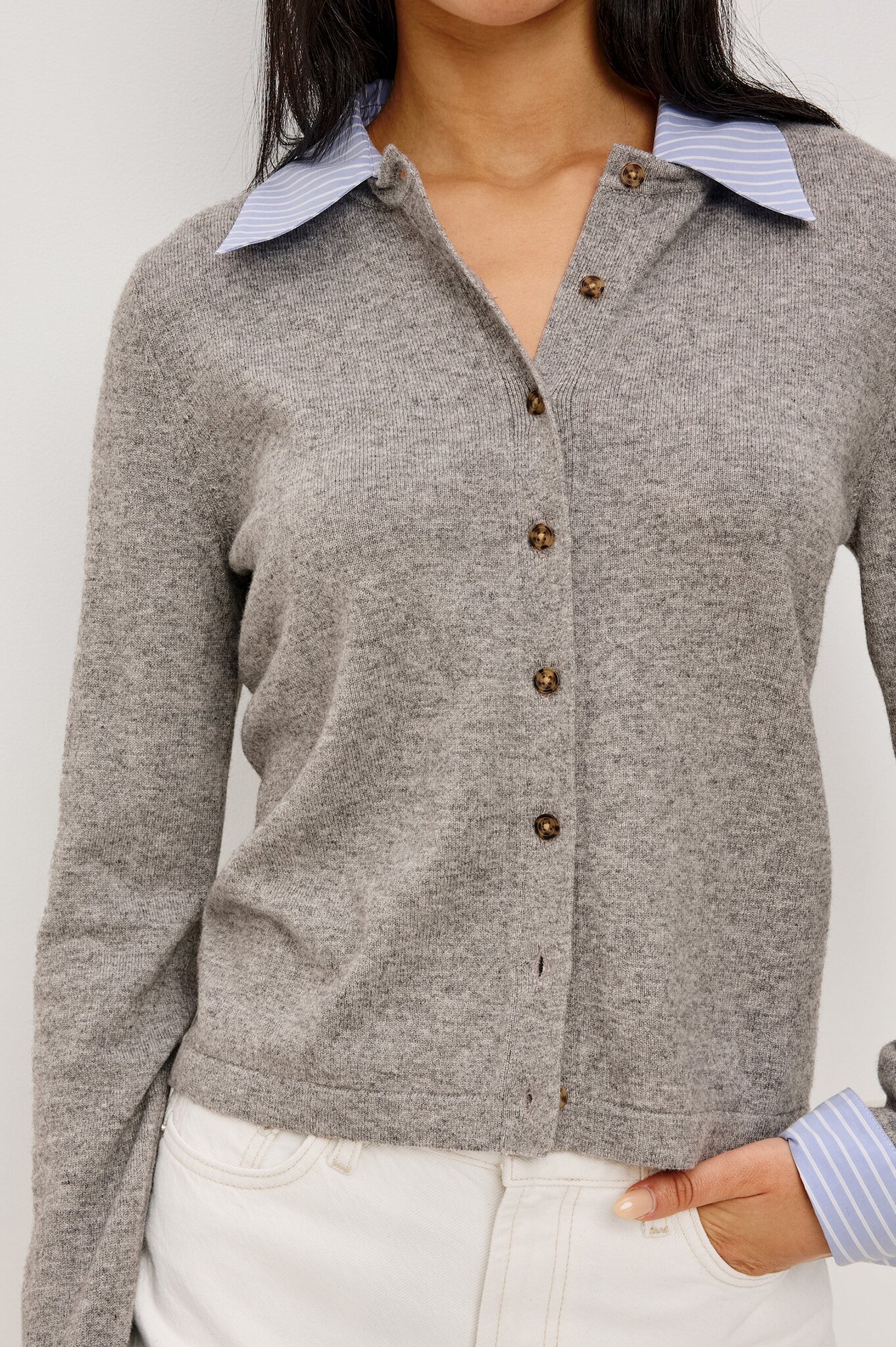 Versatile by design, the Eryn is a cotton-blend cardigan featuring a removable striped collar and cuffs, front buttons, a relaxed fit, and long sleeves.