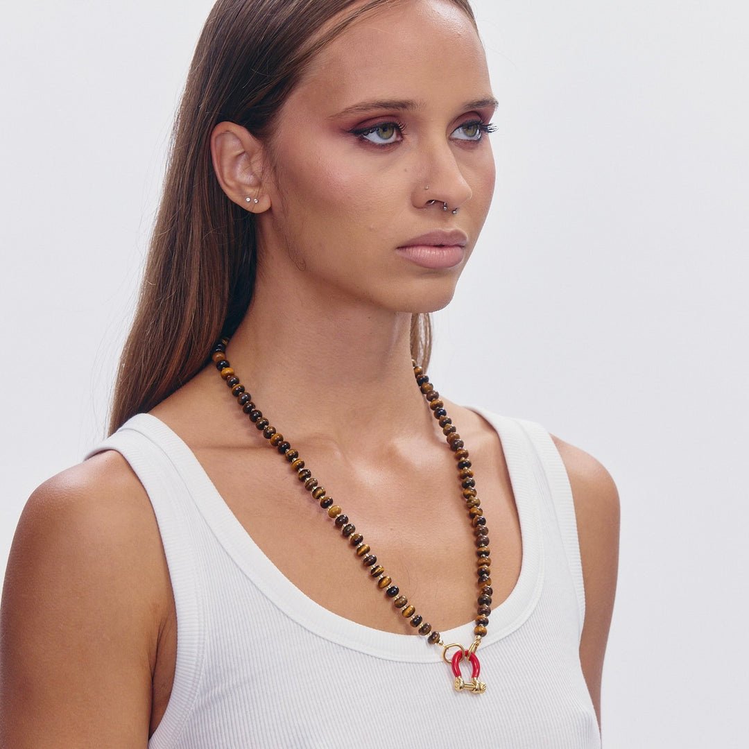 The Garth necklace is a 24 inch tiger eye necklace with 14 karat gold plated hardware and red enamel carabiner.