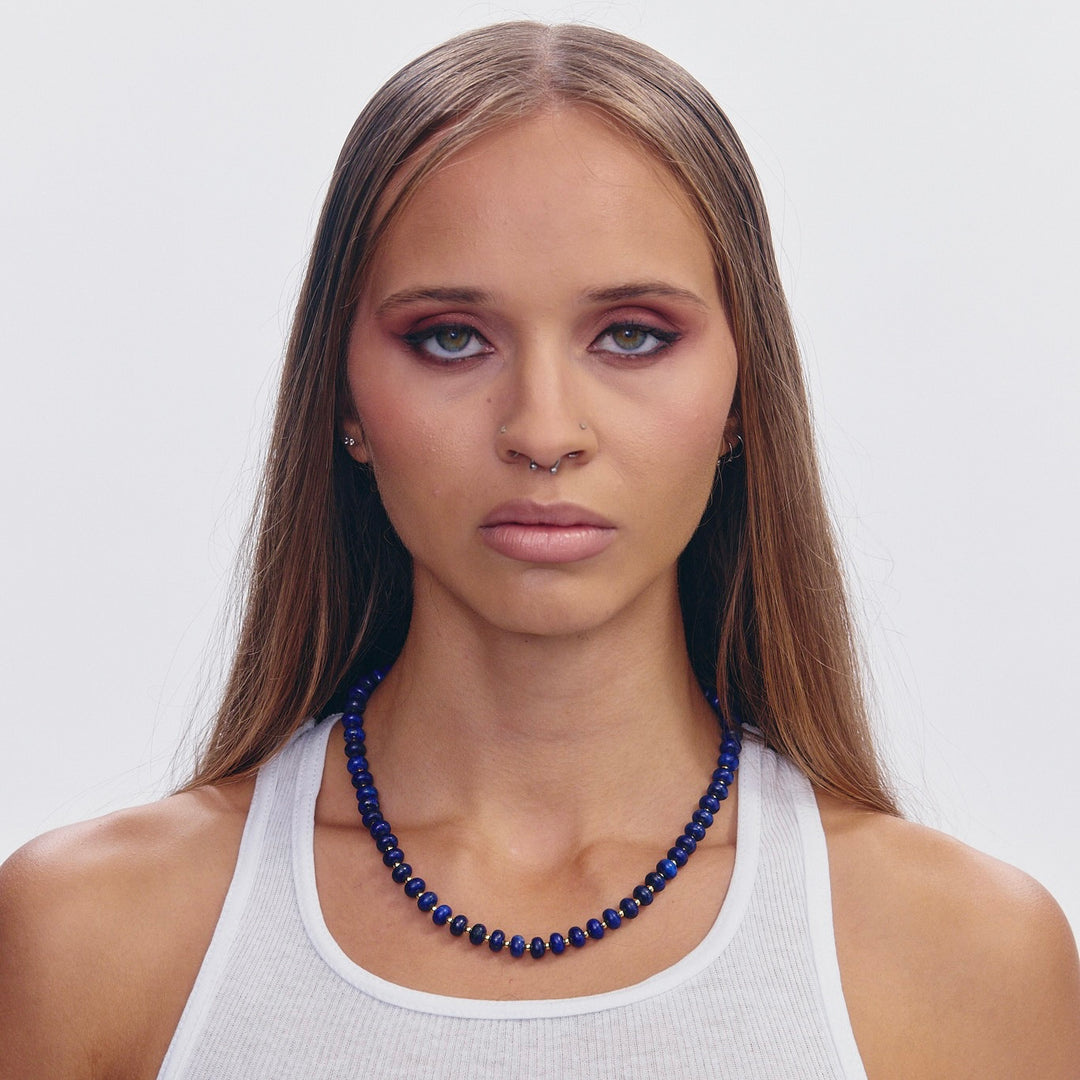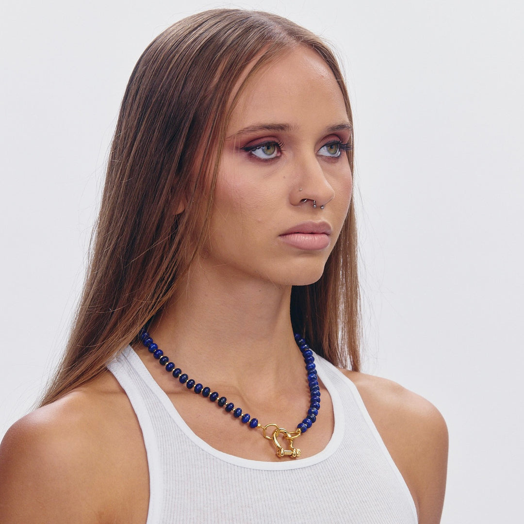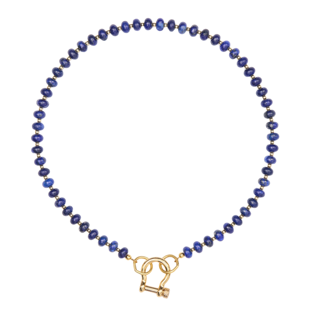 The Levi necklace is a 17 inch lapis necklace with 14 karat gold plated hardware and carabiner.
