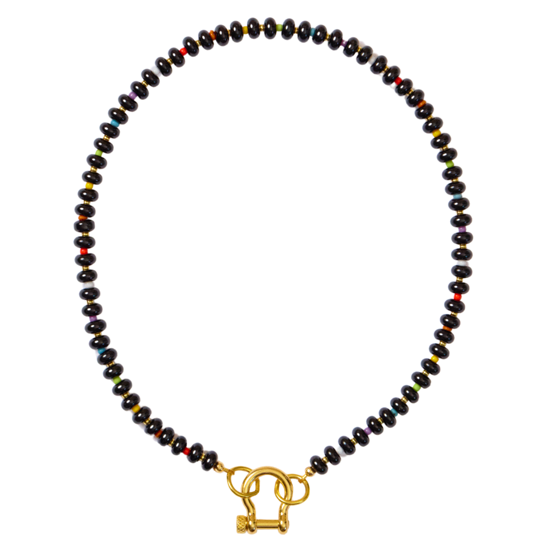 The Milo necklace is a 17 inch onyx necklace with rainbow spacer beads, 14 karat gold plated hardware, and carabiner.