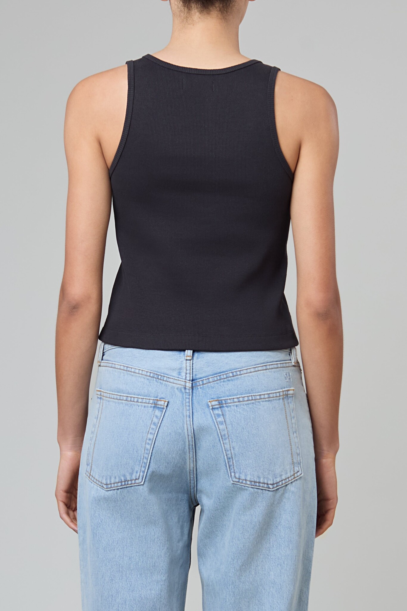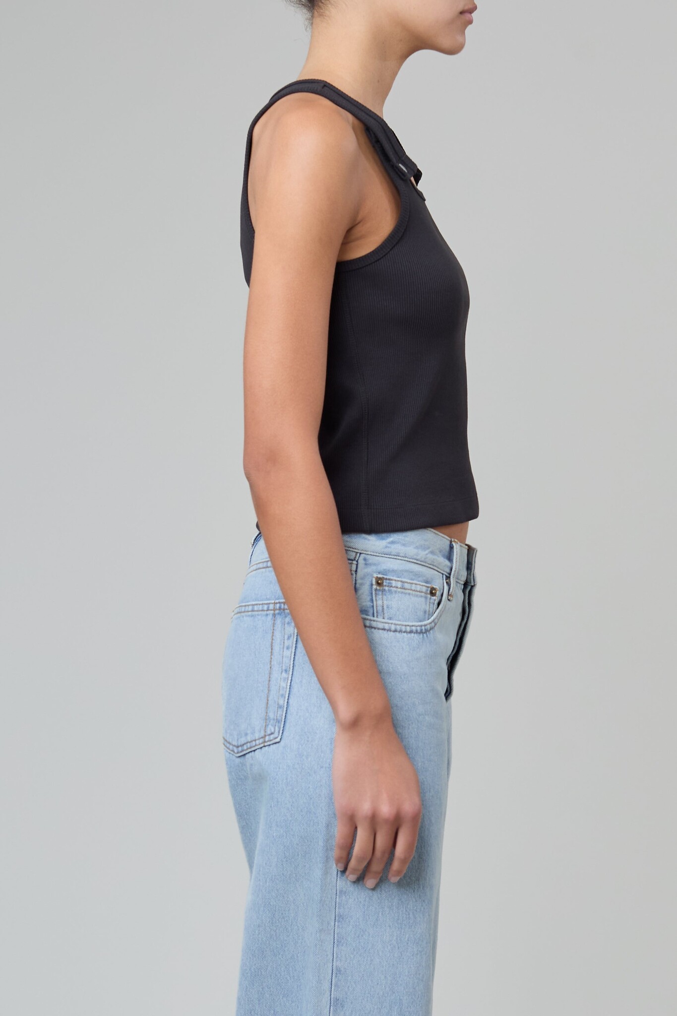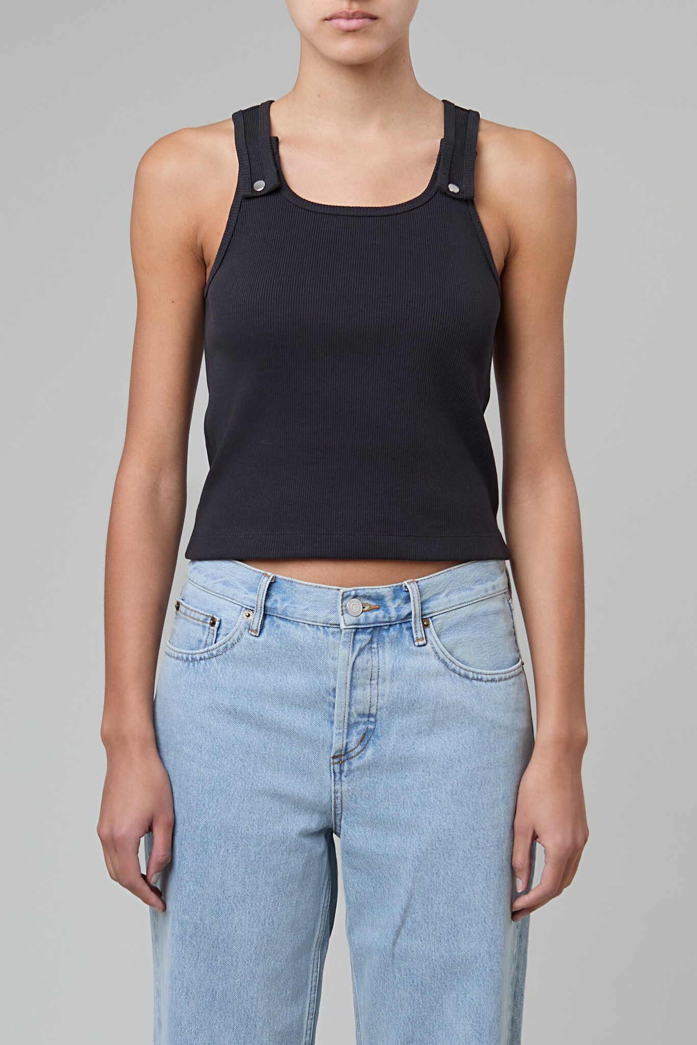 The Snap Tank is constructed of thick ribbed cotton and features functional silver snaps for adjustable strap length.