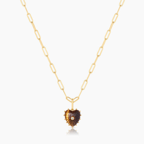 The Isabel Tiger's Eye Heart Necklace is the perfect mix of classic and modern. A small hand-carved tiger's eye heart charm with a sparkling center stone on a 14k gold plated paperclip chain. A favorite for gifting and layering.