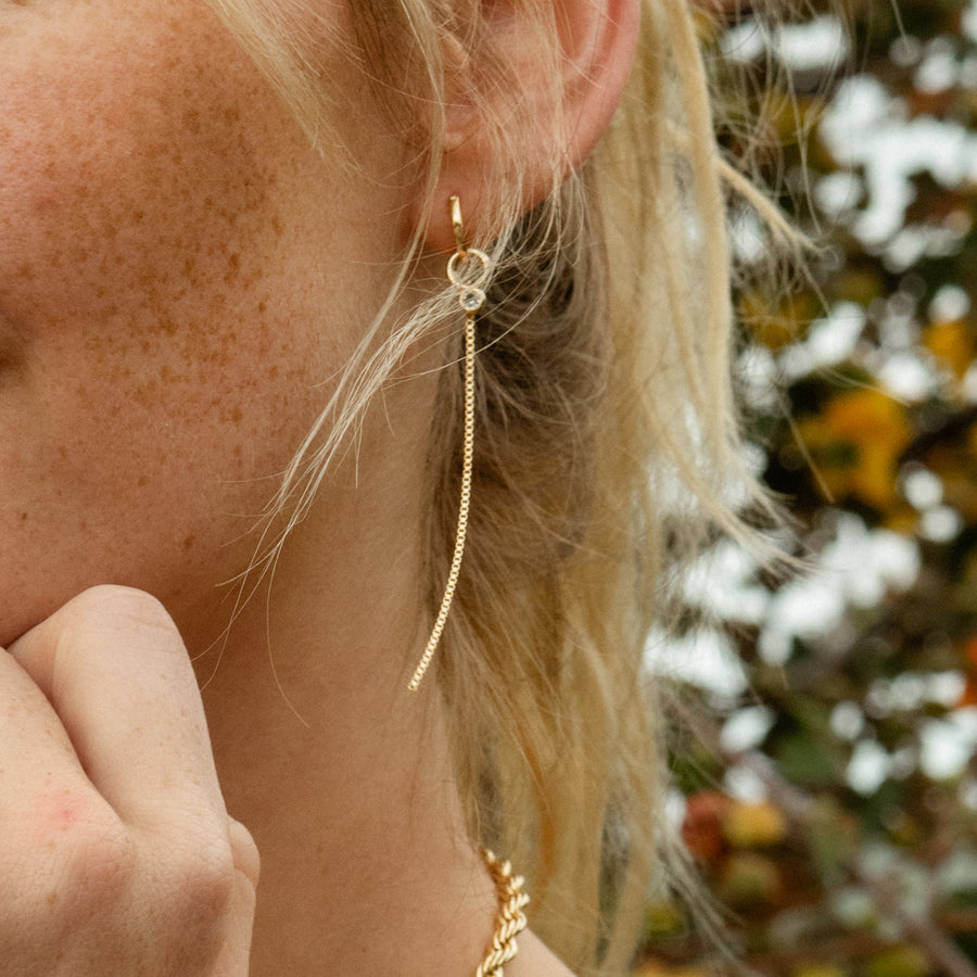 This hoop features two charms to create a versatile earring that you can mix & match. A cubic zirconia charm layered w/ a box chain creates this earring. Remove one or both charms to update the look. Without the charms, it is your favorite everyday hoop!