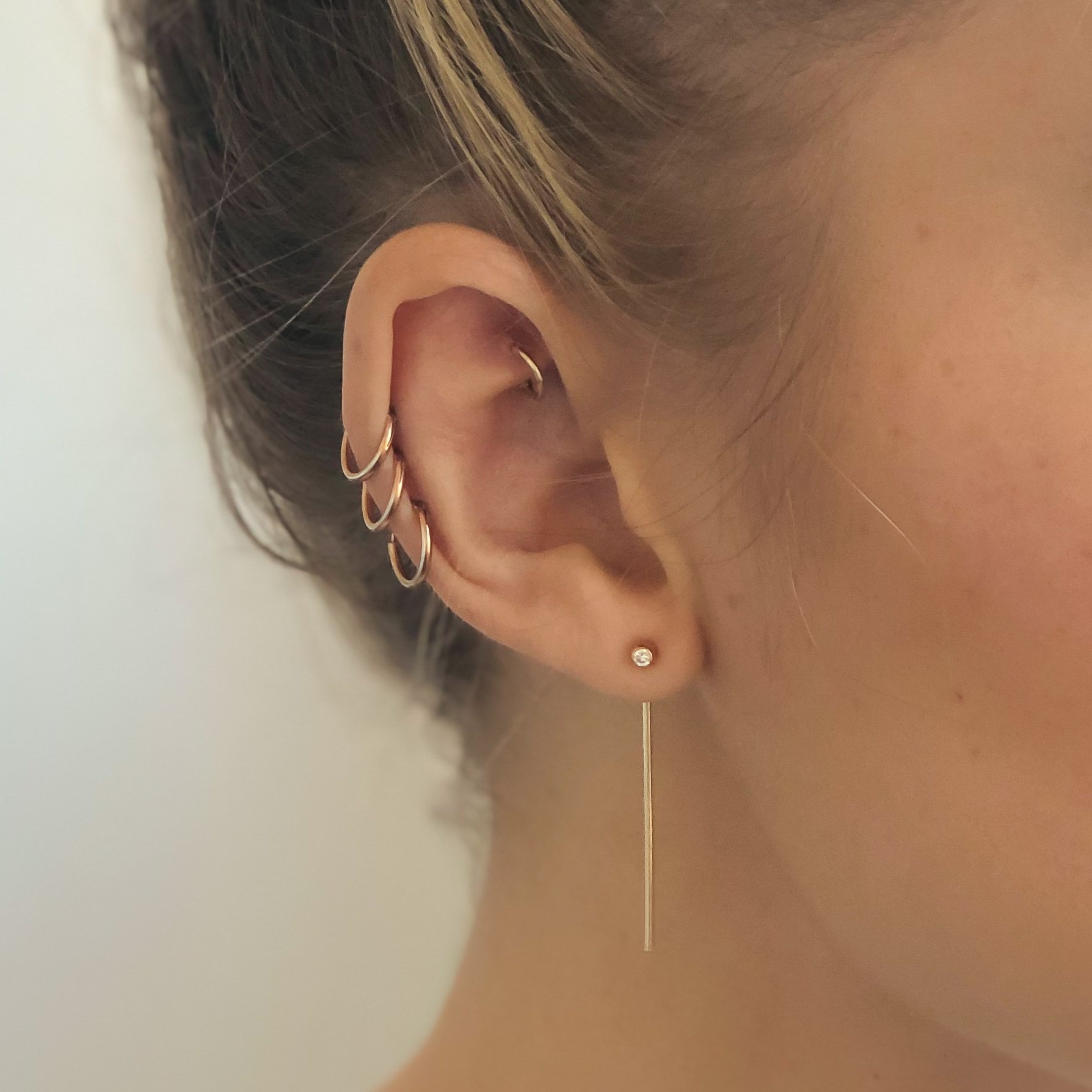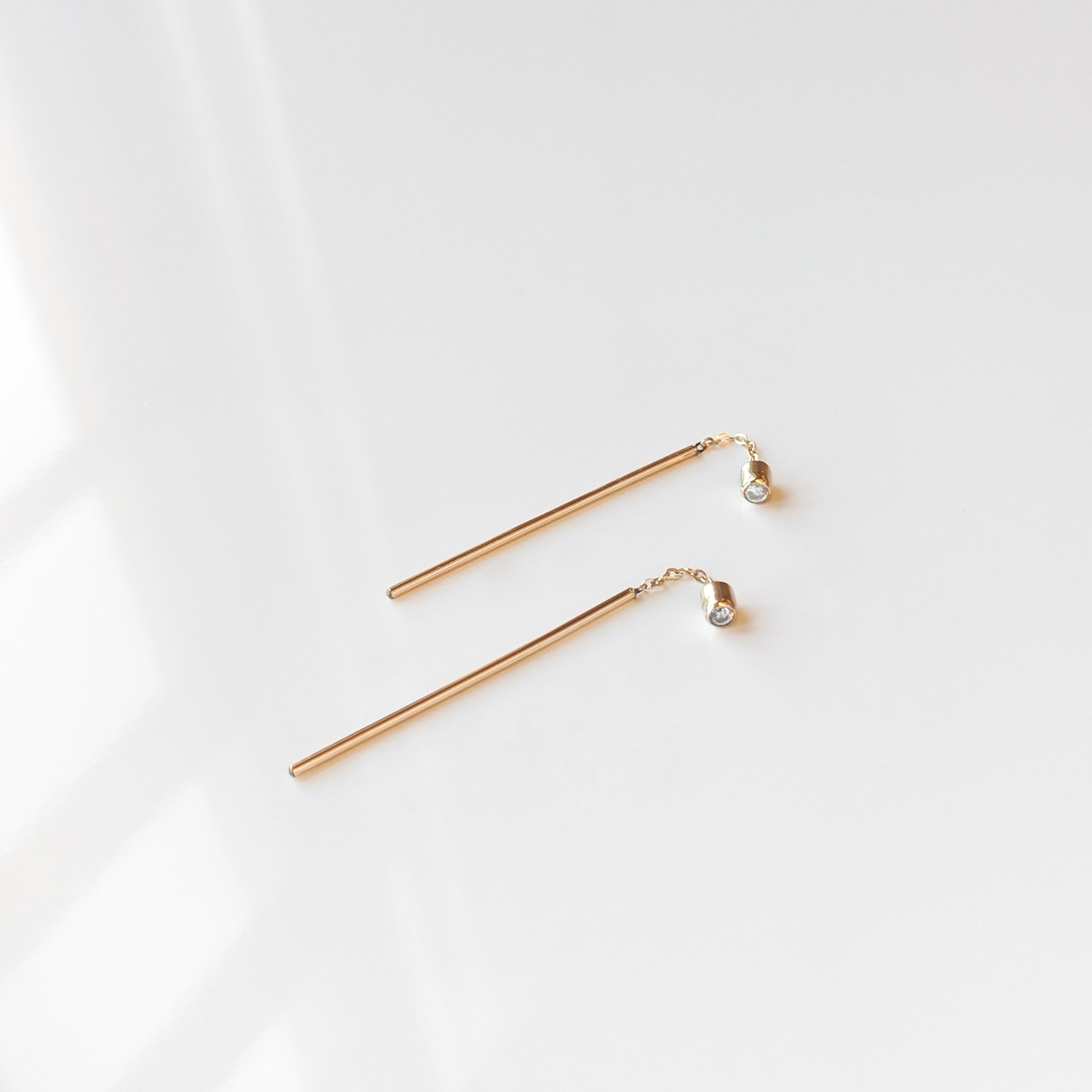 14k gold vermeil clear stone bezel stud with gold filled chain connecting to long drop bar.