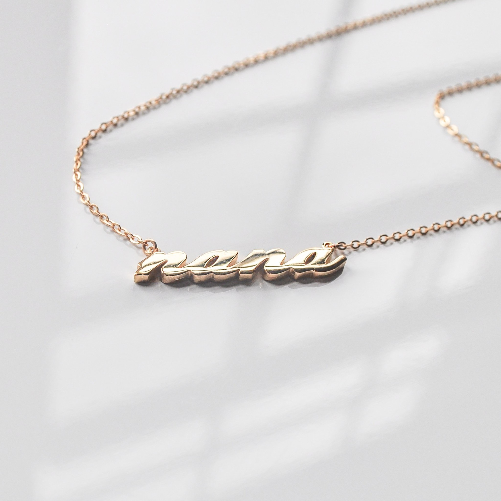 14k gold plated script necklace reading "nana" on 16" gold fill chain with 1" extender.