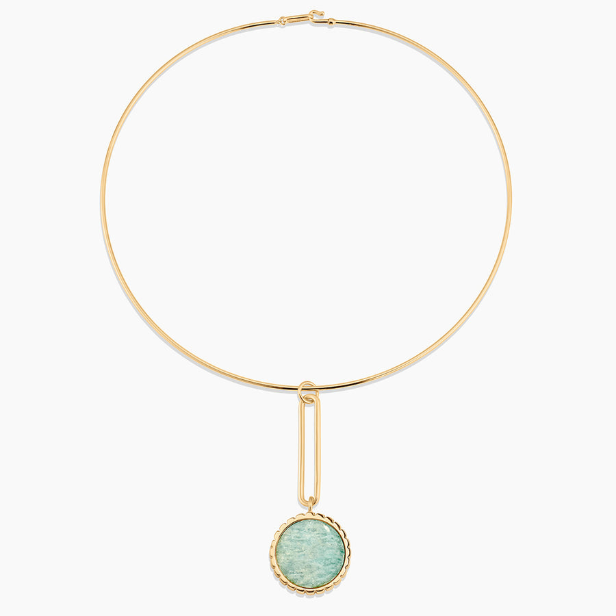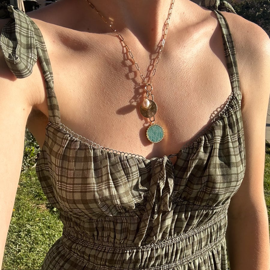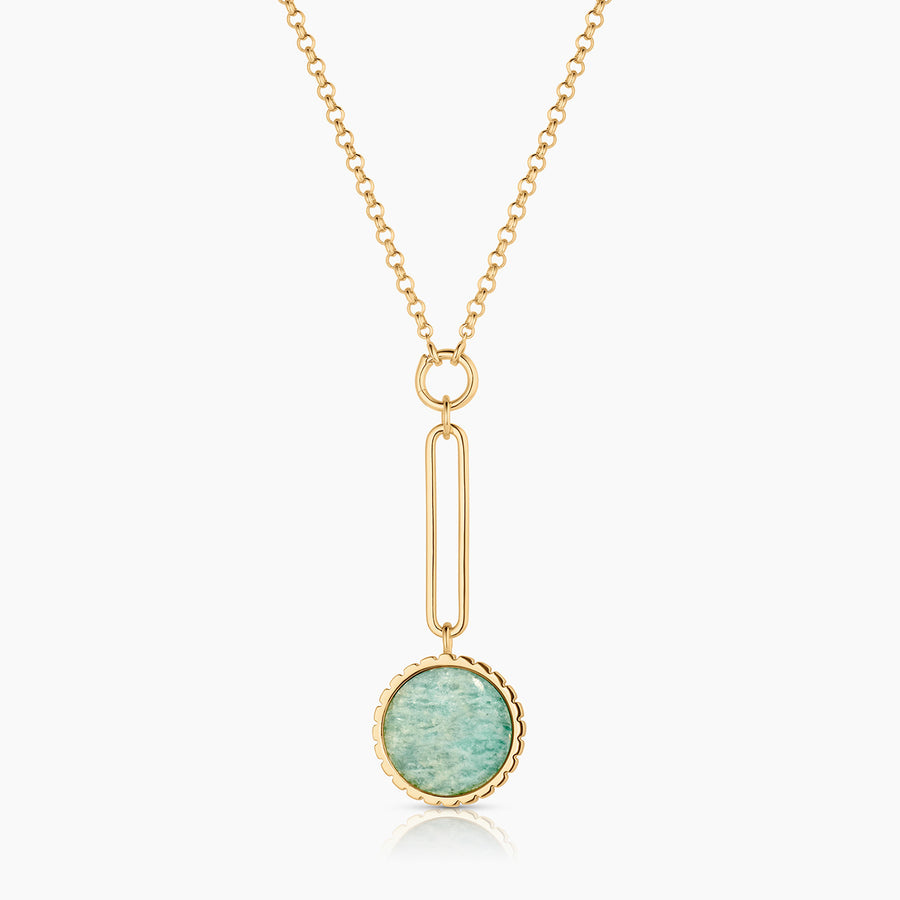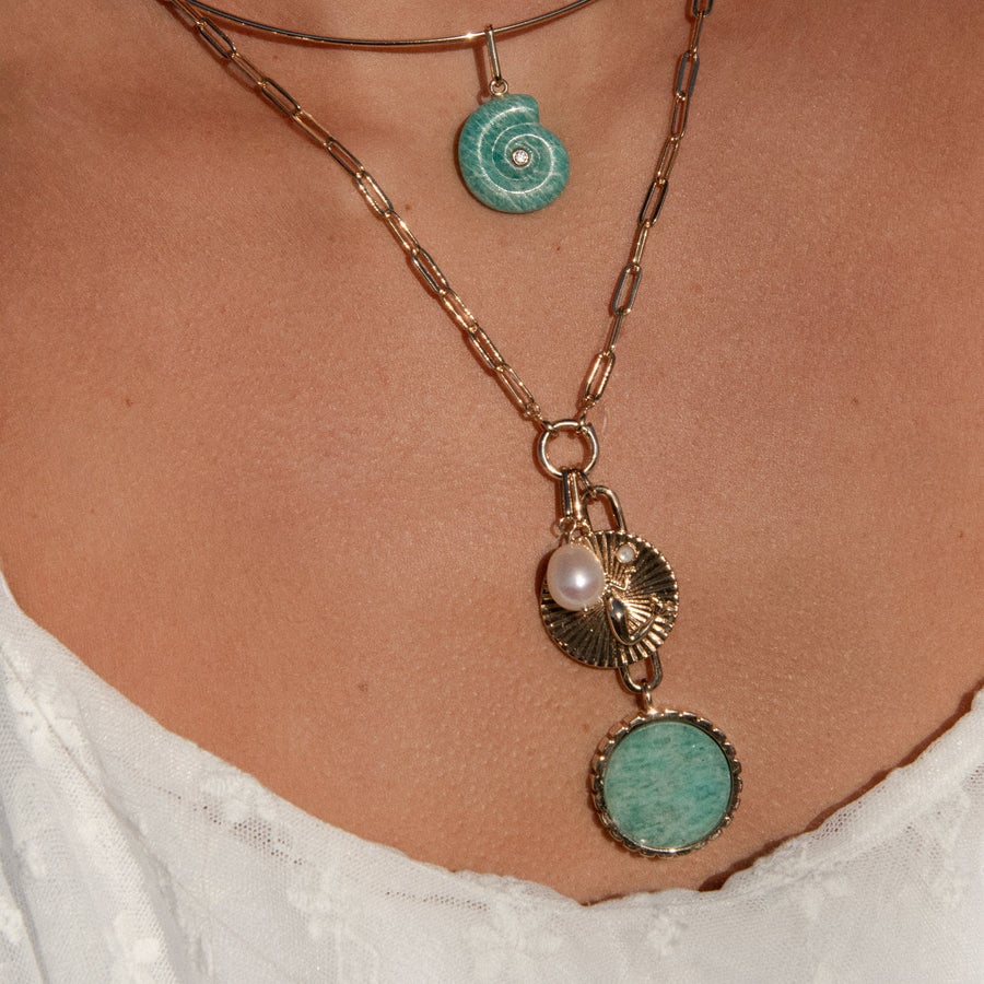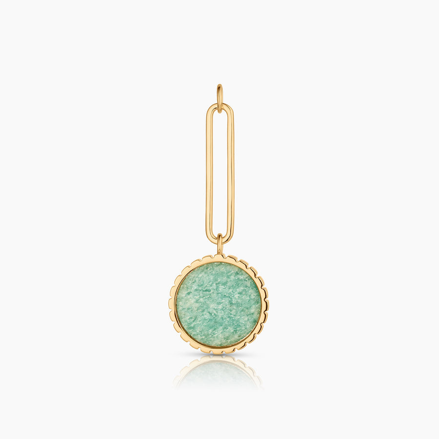 Embrace the beauty of this 100% natural gemstone with this exaggerated and modern drop charm made with hand-carved amazonite. Perfect for extra long chains, deep V-necks, and coastal getaways.