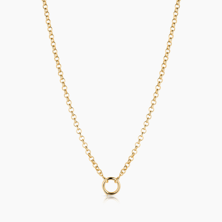 - 14k gold plated 3mm rolo chain necklace with round center hinge opening for interchangeable charm styling