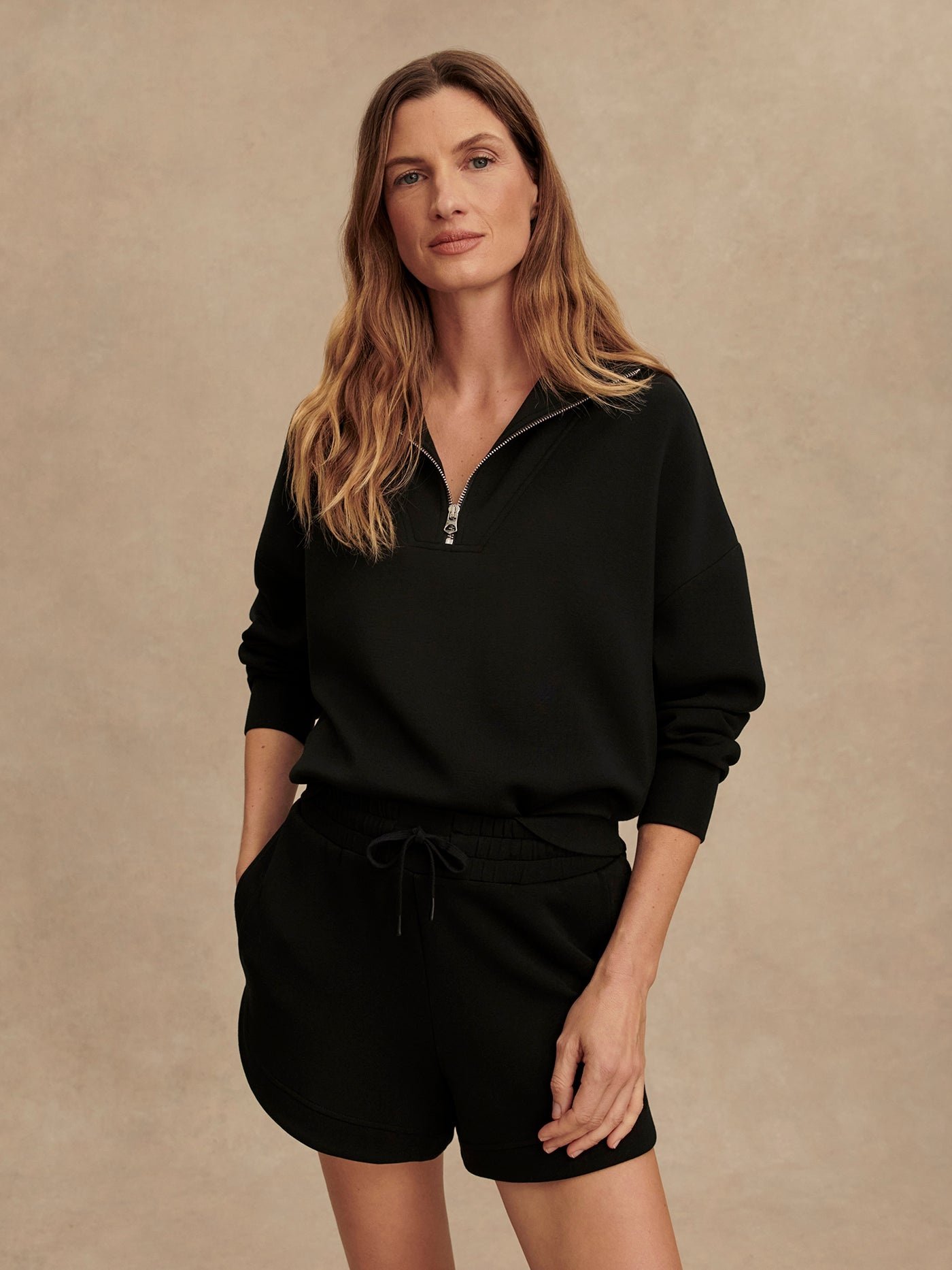 With a high-rise elastic waist and shaped hem, these 3.5" shorts seamlessly merge comfort with contemporary style. Pair them with our lightweight summer knits for effortless chic.
