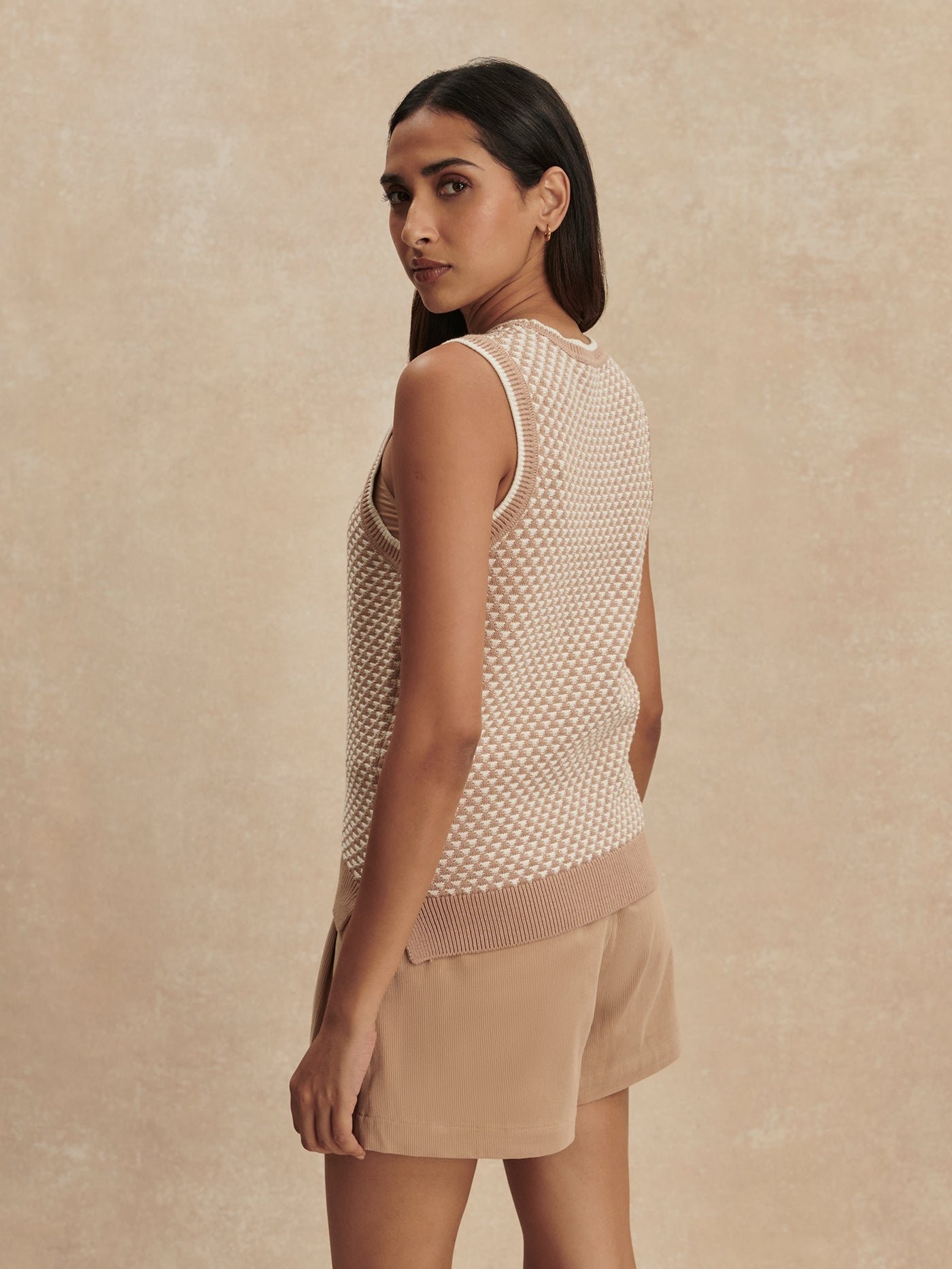 Say hello to Jenson – a knitted tank top that smartens up laid-back looks. The line and 2-color stitch have a bold effect. Style yours with dark denim for a low-key weekend look.