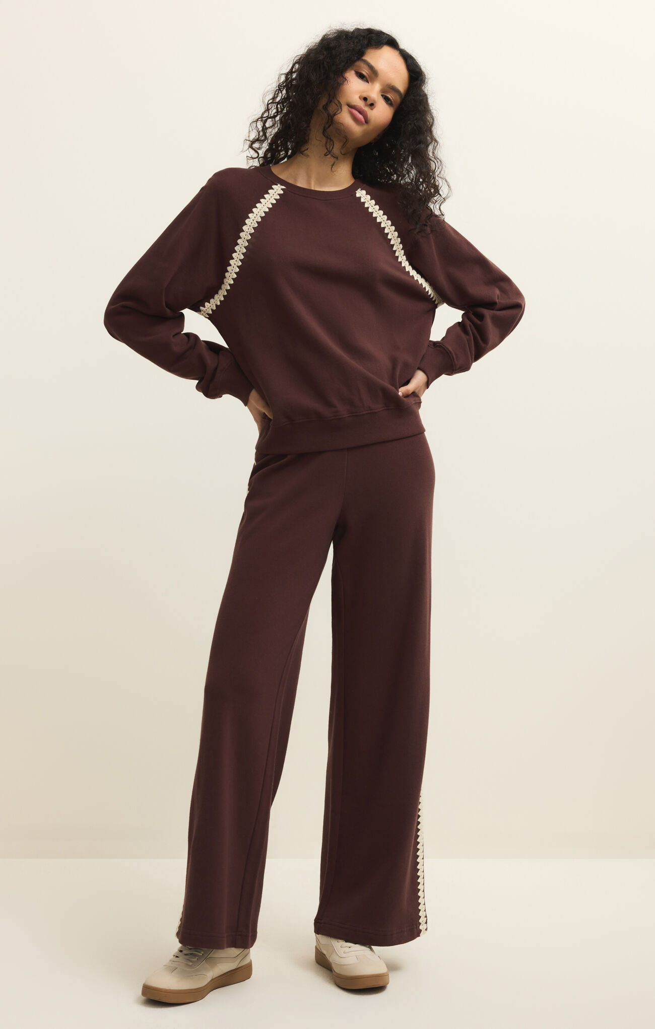 A classic crewneck sweatshirt updated with crochet details that add texture to an everyday layer.