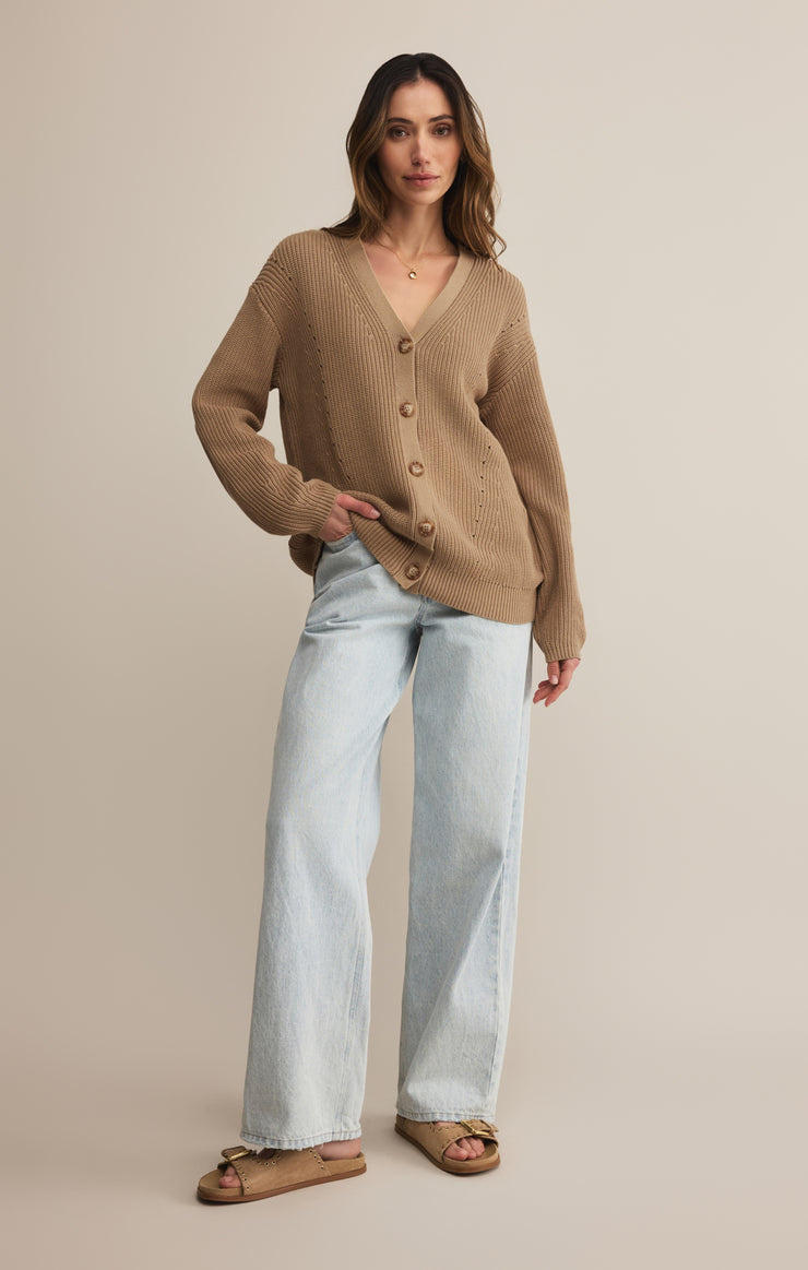 Knit from soft, textured cotton yarns in a relaxed rib stitch, this button-up sweater has a lived-in feel with thoughtful details. Featuring a deep v-neckline, subtle pointelle accents, and a slouchy silhouette.